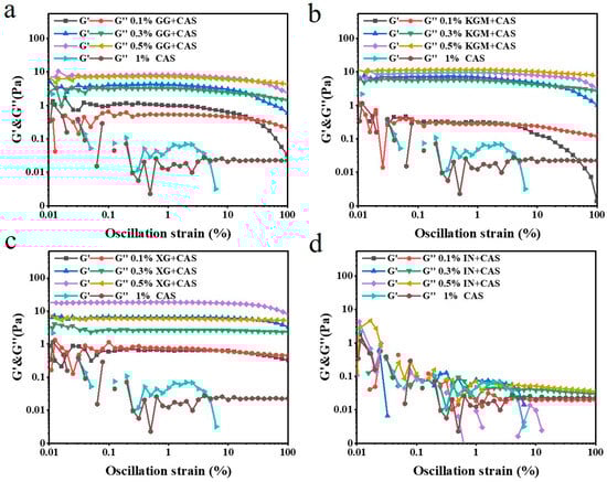 Oscillation amplitude of GG/CAS emulsions (a), KGM/CAS emulsions (b), XG/CAS emulsions (c), and IN/CAS emulsions (d).