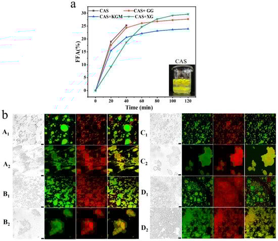 FFA release (a) and CLSM images (b) of CAS emulsion with 0.5% polysaccharide after gastrointestinal digestion (A: polysaccharide free, B: GG, C: KGM, D: XG, 1: gastric phase, and 2: intestine phase, green: oil phase, red: aqueous phase). Scale bar: 25 µm.