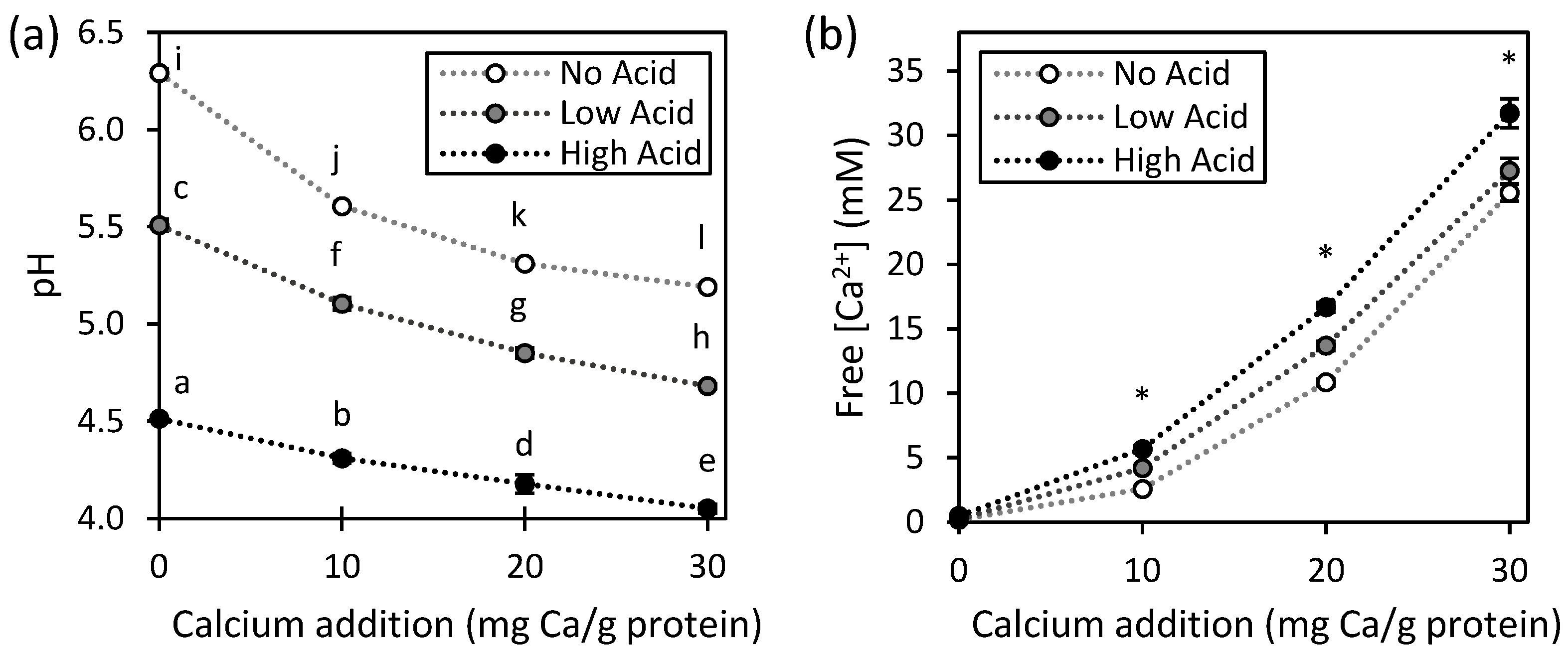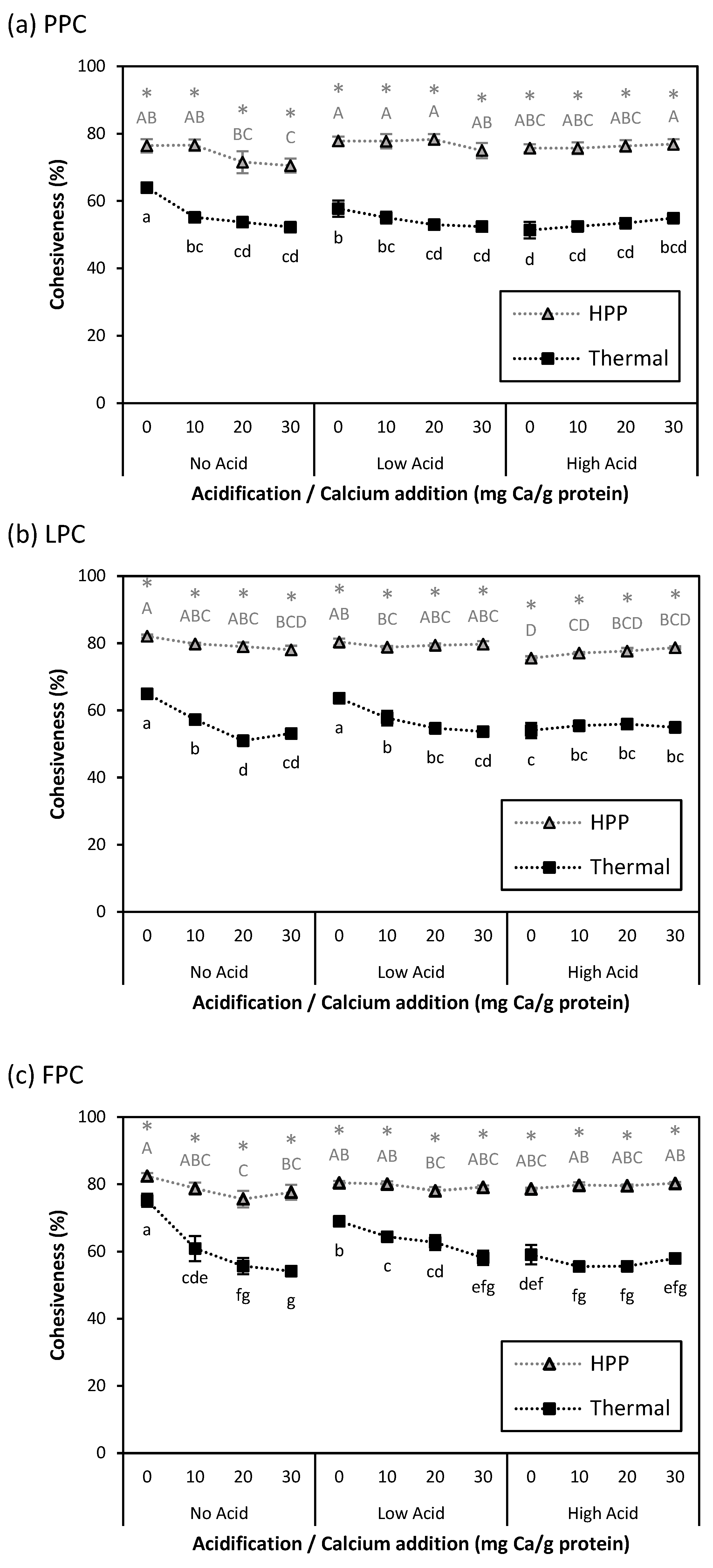 ). Values represent averages of independent biological triplicates, which are each an average of technical triplicates. Error bars represent ±1 standard error. Different uppercase and lowercase letters indicate significant differences within HPP- and thermally processed samples, respectively. Within the same acidification and calcium addition level, * indicates significant difference between process types. PPC-High Acid-0 mg Ca/g protein has biological duplicates due to a sample loss.
