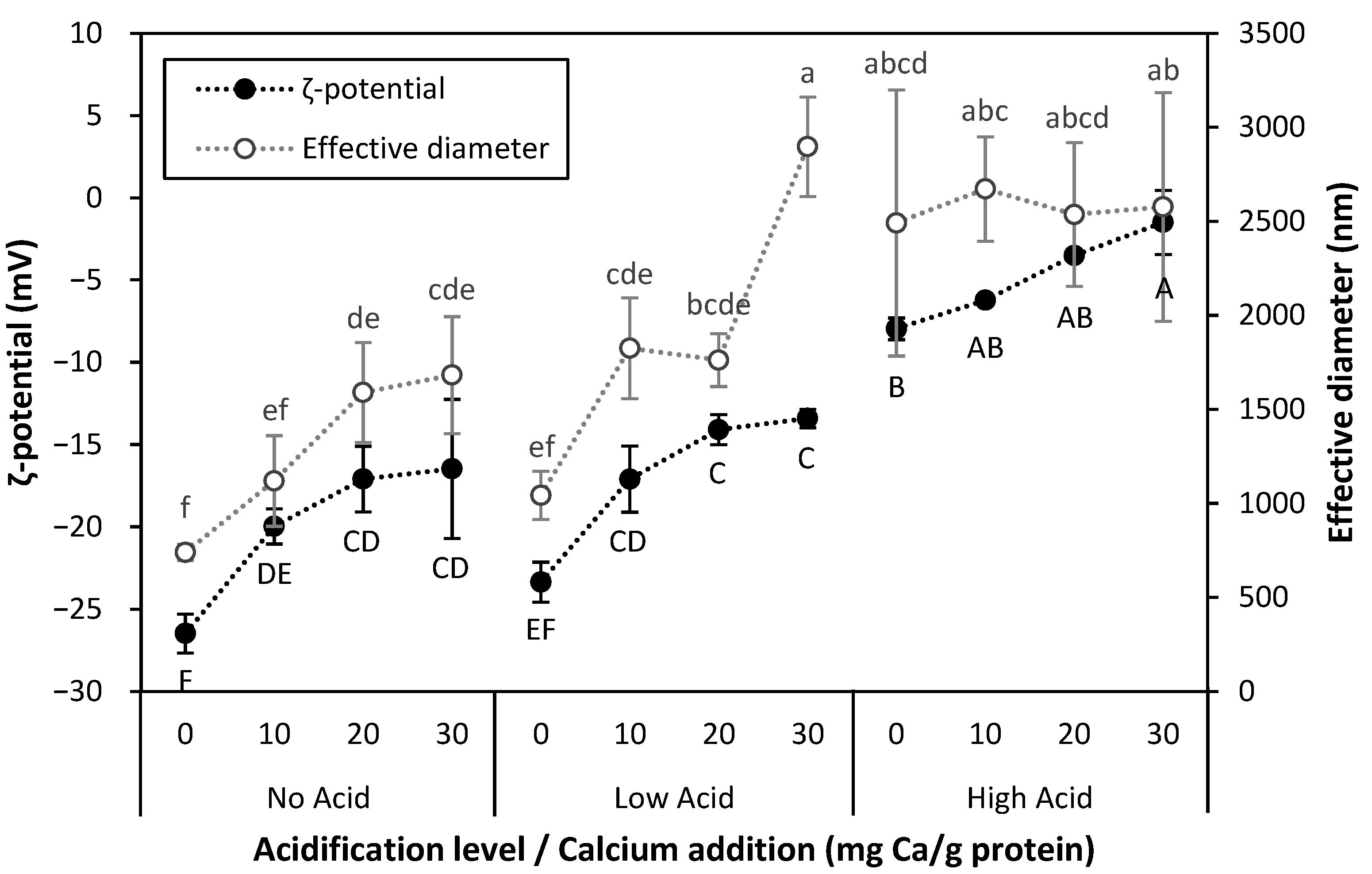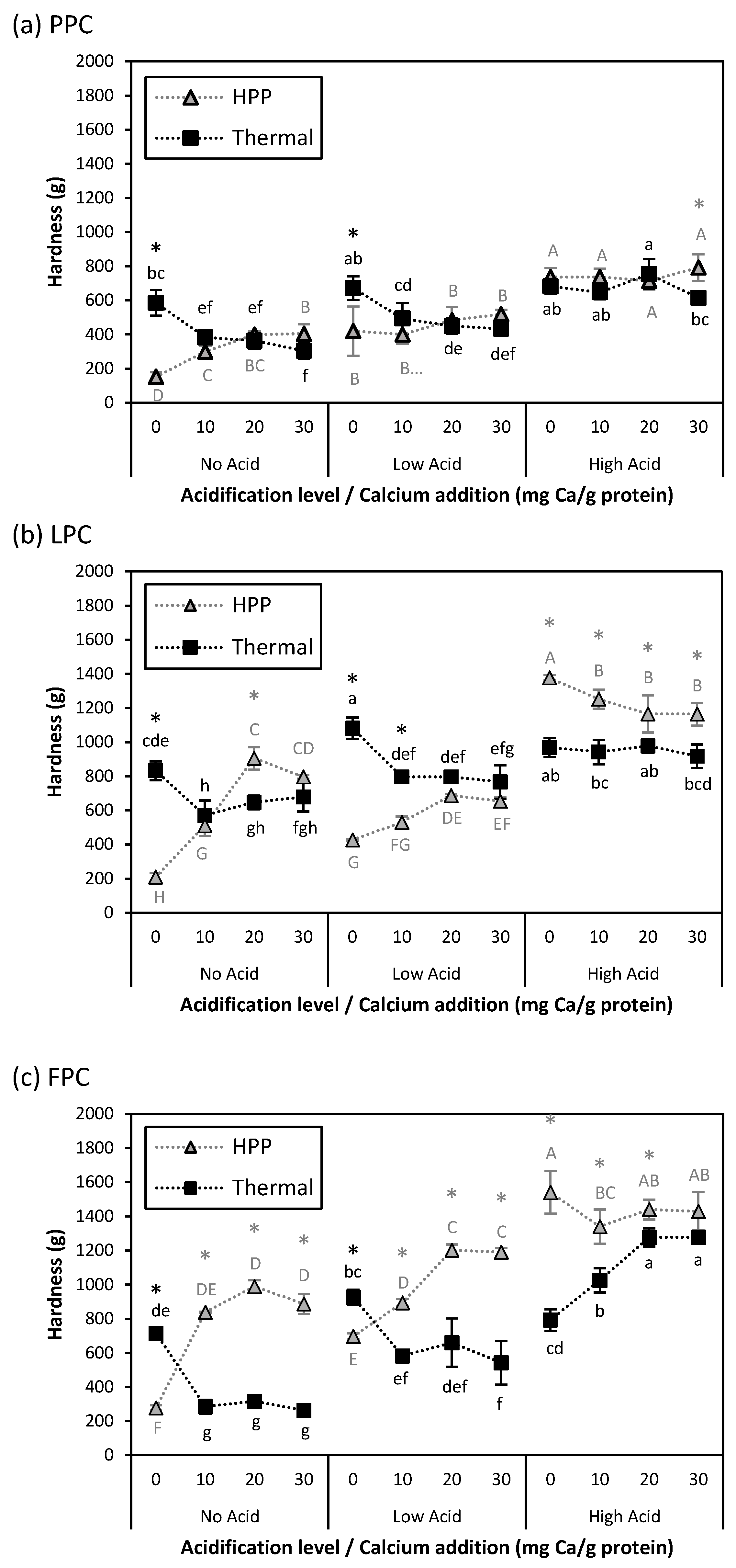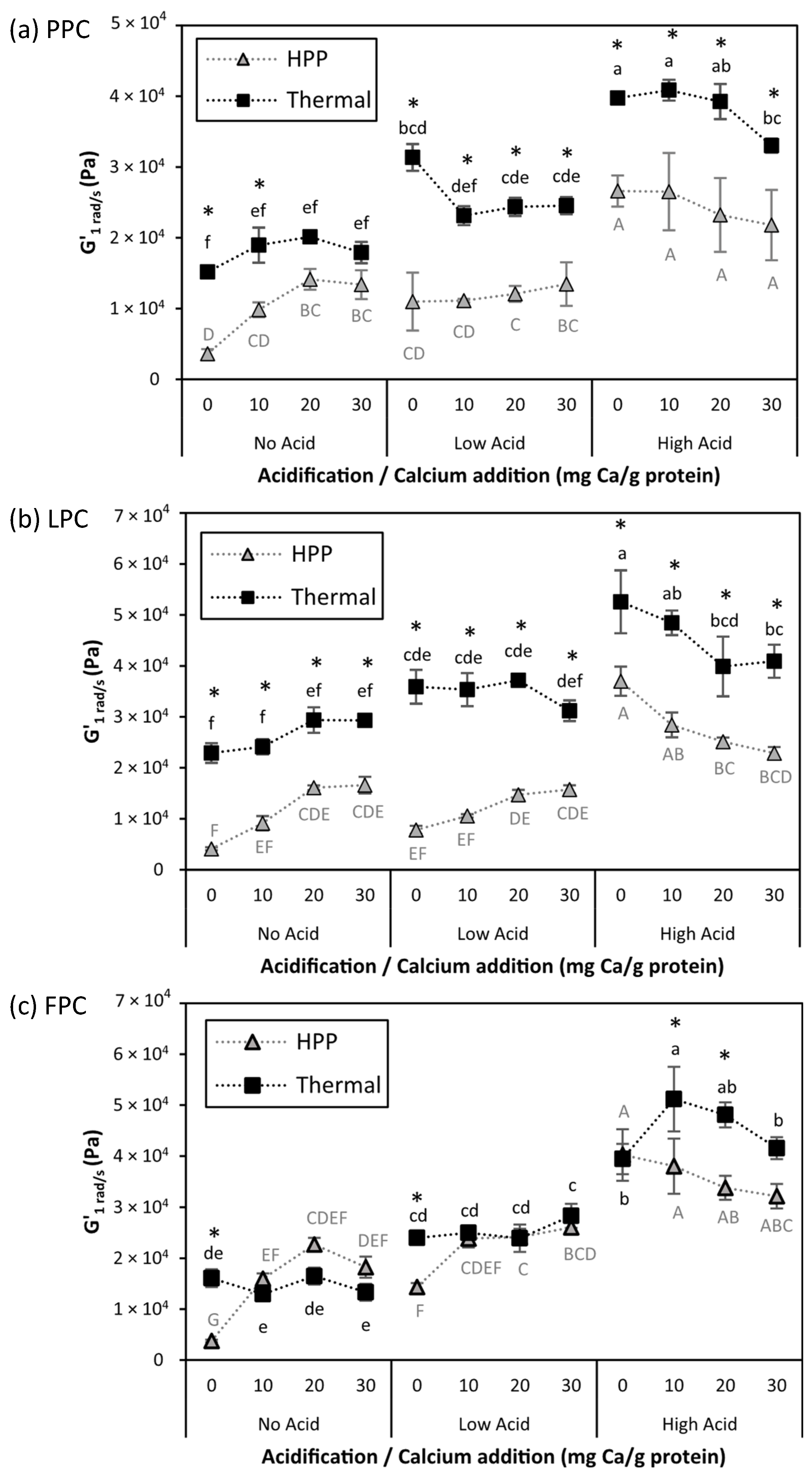 ) samples. Values represent averages of independent biological triplicates, each being an average of technical triplicates. Error bars represent ±1 standard error. Different uppercase and lowercase letters indicate significant differences within HPP- and thermally processed samples, respectively. Within the same acidification and calcium addition level, * indicates significant difference between process types. PPC-High Acid-0 mg Ca/g protein, PPC-High Acid-10 mg Ca/g protein, PPC-High Acid-20 mg Ca/g protein had only biological duplicates, due to a sample loss.