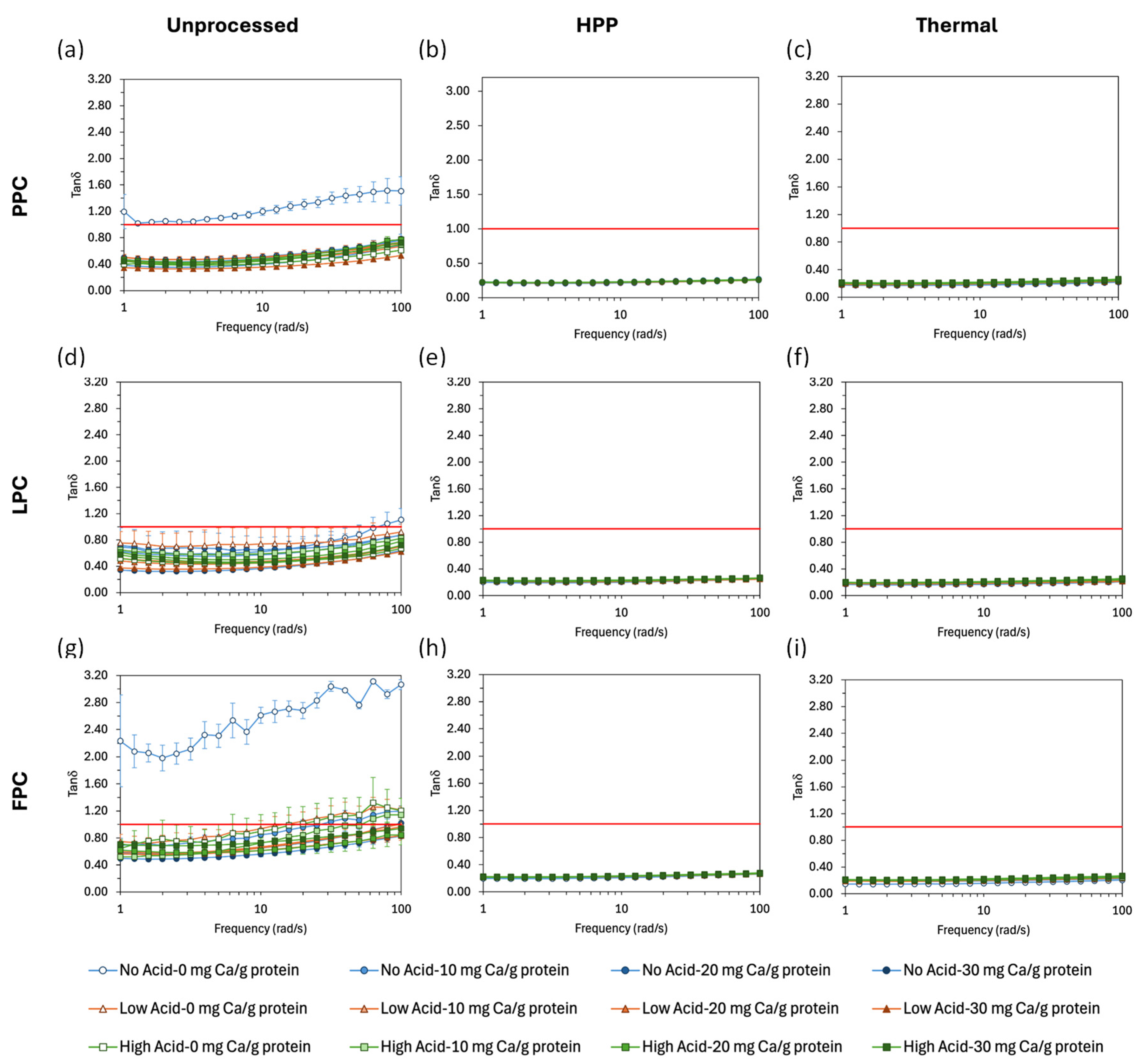 2.2. Effect of Process Type, Acidification, and Calcium Addition on the Rheological Properties and Microstructure of Pulse Protein Concentrate Gels