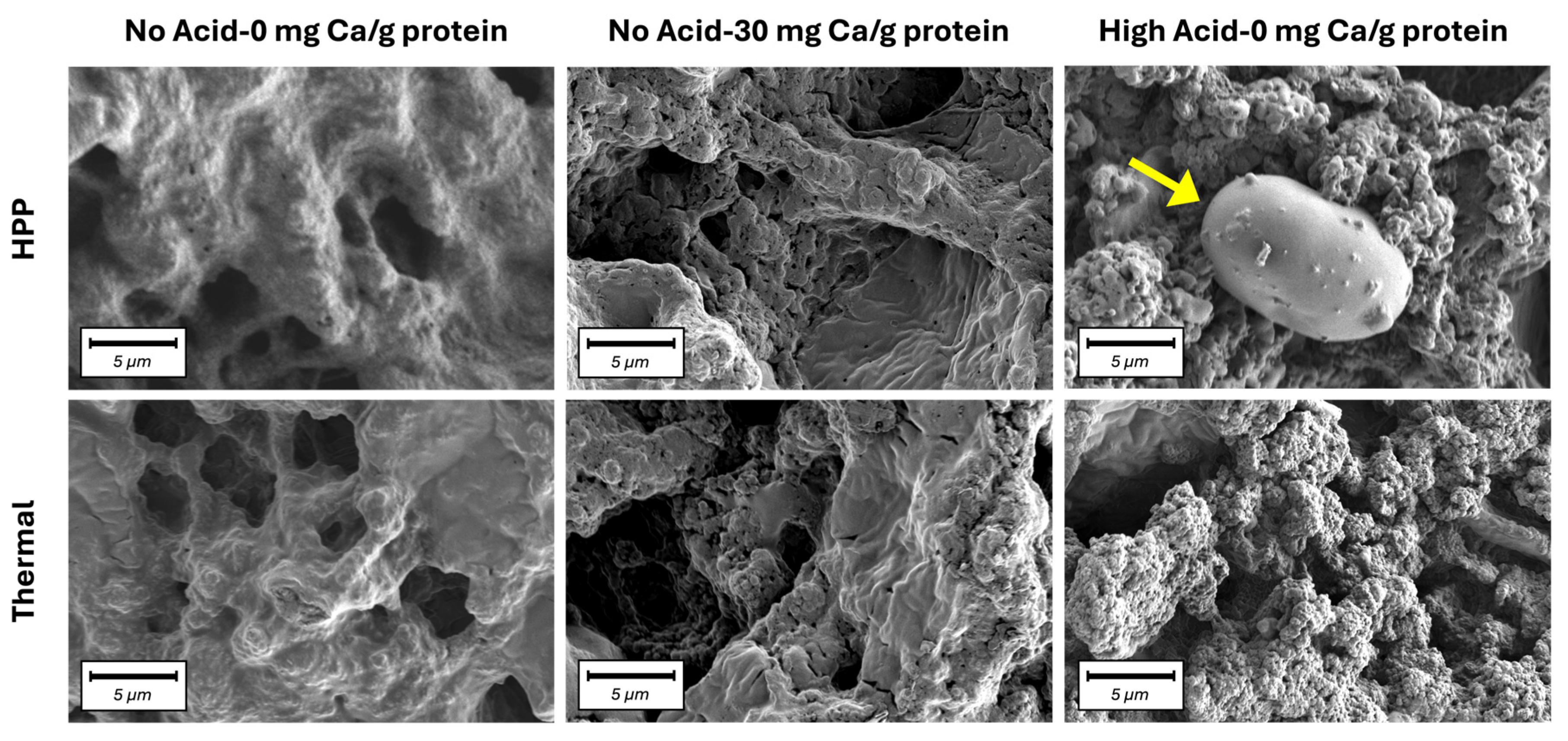 - Wang, L.; Moraru, C.I. High-pressure structuring of milk protein concentrate: Effect of pH and calcium. J. Dairy Sci. 2021, 104, 4074–4083. [Google Scholar] [CrossRef]