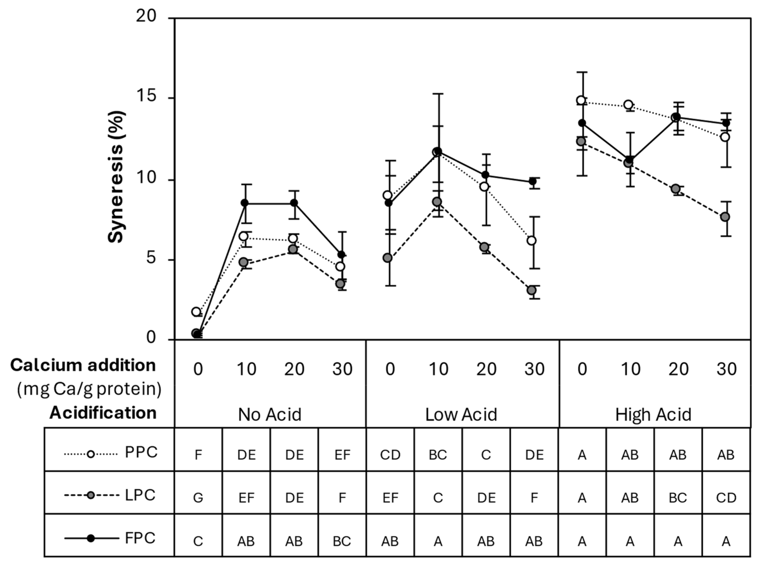 | Acidification | Calcium (mg Ca/g Protein) | Water Holding Capacity (%) | ||||||||