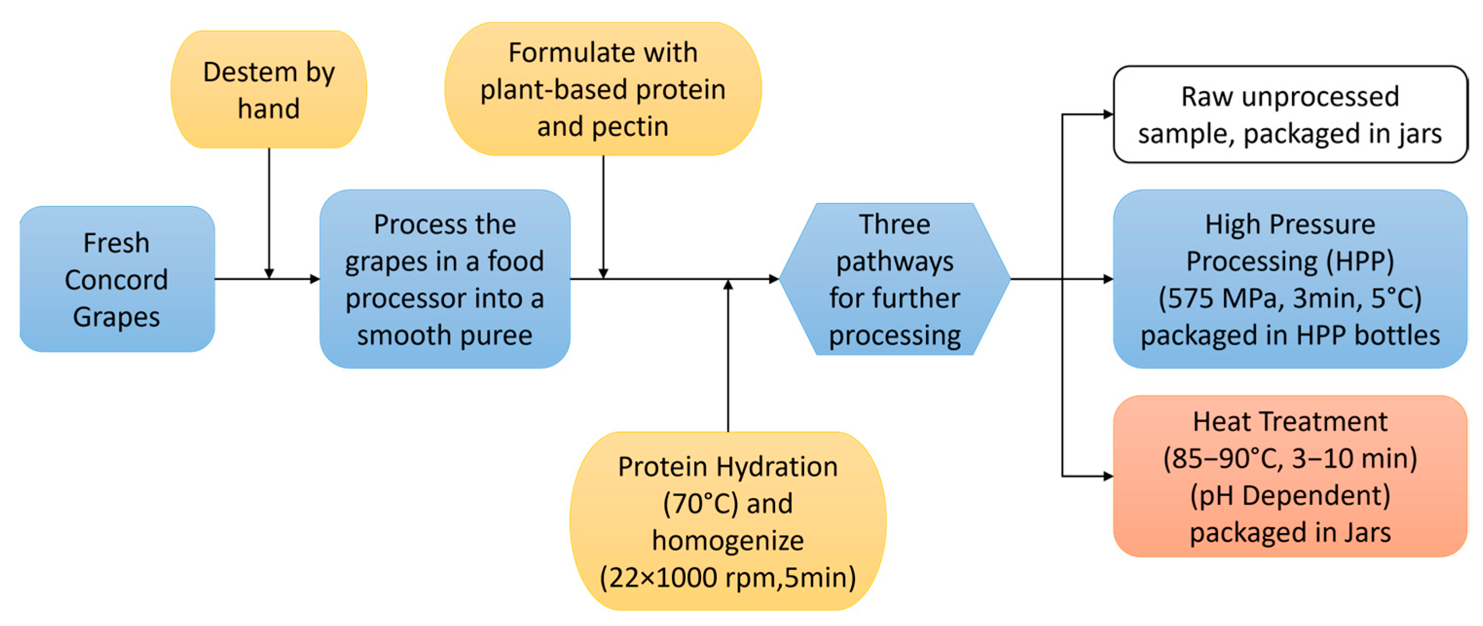 - Li, Y.; Padilla-Zakour, O. High Pressure Processing vs. Thermal Pasteurization of Whole Concord Grape Puree: Effect on Nutritional Value, Quality Parameters and Refrigerated Shelf Life. Foods 2021, 10, 2608. [Google Scholar] [CrossRef] [PubMed]