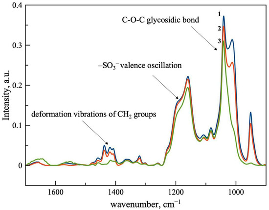 ATR-FTIR spectra of SBECD (3, green line) and cross-linked particles Pol-SBECD-1 (1, blue line) and Pol-SBECD-2 (2, red line). Concentration of cyclodextrin tori is 0.1 M in all samples. Aqueous solutions at 22 °C.