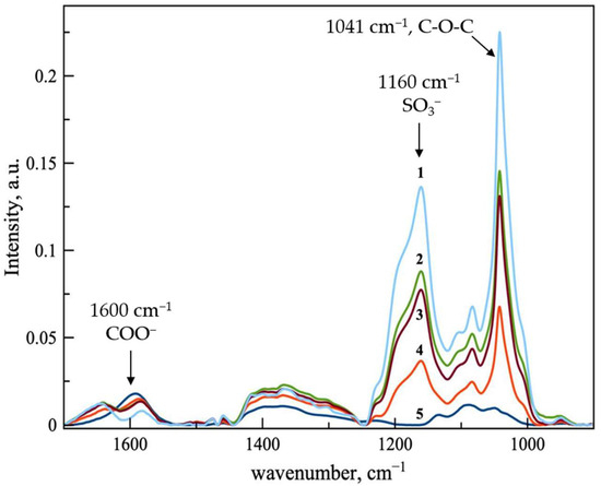 ATR-FTIR spectra of ferrous D-gluconate (line 5, blue) and ferrous D-gluconate complexes with SBECD in variable molar ratios: line 1—1:2; 2—1:1.5; 3—1:1; 4—2:1. Aqueous solutions at 22 °C.
