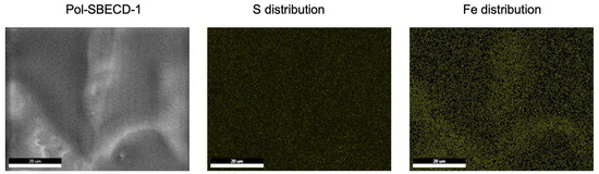 The above-described findings are supported by scanning electron microscopy (SEM) and energy-dispersive X-ray spectroscopy (EDX) analyses. Figure 4 depicts representative micrographs illustrating the morphological features of Pol-SBECD-1 particles loaded with ferrous D-gluconate. Elemental maps highlighting sulfur atoms demonstrate the even distribution of CD tori, along with the homogenous spatial arrangement of iron atoms. Remarkably, no discernible areas devoid of iron enrichment are detectable, suggesting uniformity in iron distribution in the carrier.