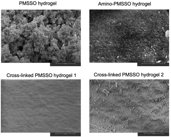 Scanning electron microscopy of PMSSO hydrogel, amino-PMSSO hydrogel, and cross-linked hydrogels with various MeSiO1.5/SiO2 ratio.