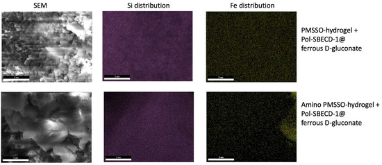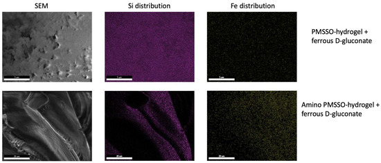 Scanning electron microscopy and EDX (Si and Fe) for the PMSSO hydrogel and amino-PMSSO hydrogel loaded with ferrous D-gluconate.
