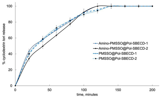 To clarify these issues, we conducted control experiments examining the kinetic profiles of “empty” SBECD cross-linked particles loaded into PMSSO-hydrogels (Figure 8). All obtained release curves were similar, revealing negligible deviations among the different particle and/or hydrogel samples. Within the first two hours, the complete particle release occurred at pH 7.4. Interestingly, a delay in release was observed for the system combining amino-PMSSO with Pol-SBECD-2 particles, hinting at possible electrostatic interactions between the hydrogel’s amino moieties and the sulfonate groups present in the particles.