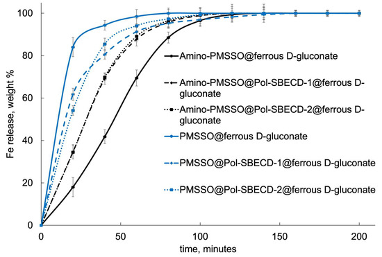 Figure 9 demonstrates the kinetic curves for iron release. The unmodified PMSSO hydrogel exhibits the fastest iron release: it takes less than an hour for almost complete release. In contrast, the amino-PMSSO hydrogel exhibits a clearly delayed release in the acidic environment. The use of complexes with cross-linked particles changes the picture: for the aminated hydrogel, release is accelerated, with no clear differences observed between the two particle types. Conversely, for the unmodified gel, the use of particles allows for a slower release.