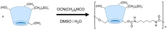 The dense of cross-linking could play a dramatic role in the sorption capacity [10]. Thus, we have synthetized two types of particles, achieved through covalent cross-linking of individual cyclodextrin units with varied amount of 1,6-hexamethylene diisocyanate (HMDI) at the hydroxyl moieties of the SBECD molecules. This process was carried out in a water–dimethylsulfoxide (DMSO) mixture. As depicted schematically in Scheme 1, the synthesis involved primarily the more reactive primary hydroxyl groups of the cyclodextrin monomers. Nonetheless, secondary hydroxyl groups could also engage in the reaction, contributing to the formation of a branched macromolecular architecture.