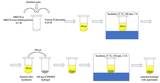 Schematic representation of the synthesis could be observed in Scheme 2. The solution obtained in Section 4.2.11 was poured into the gel and placed in an incubator for 1.5 h at 37 degrees Celsius and a stirring speed of 150 rpm. In the case of loading hydrogels with only ferrous D-gluconate or only SBECD particles, the volume of the other component was replaced by water. After this, it was centrifuged (10,000 rpm, 2 min for complete sedimentation of the gel particles), then the supernatant was collected, and, thus, saturated gels were obtained.