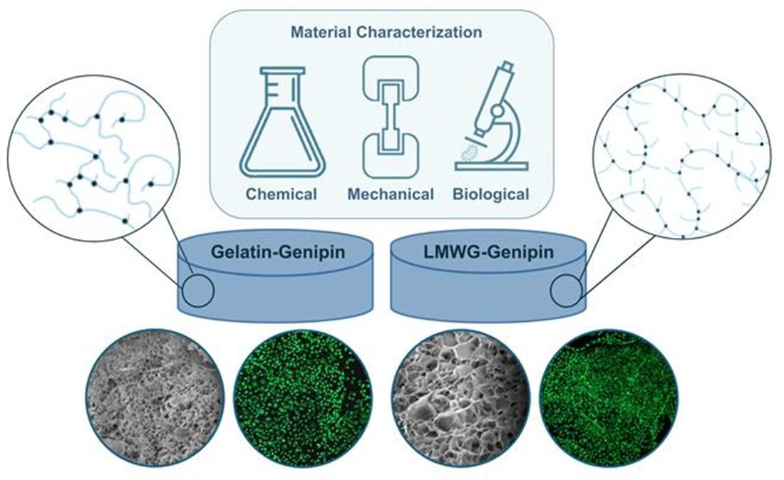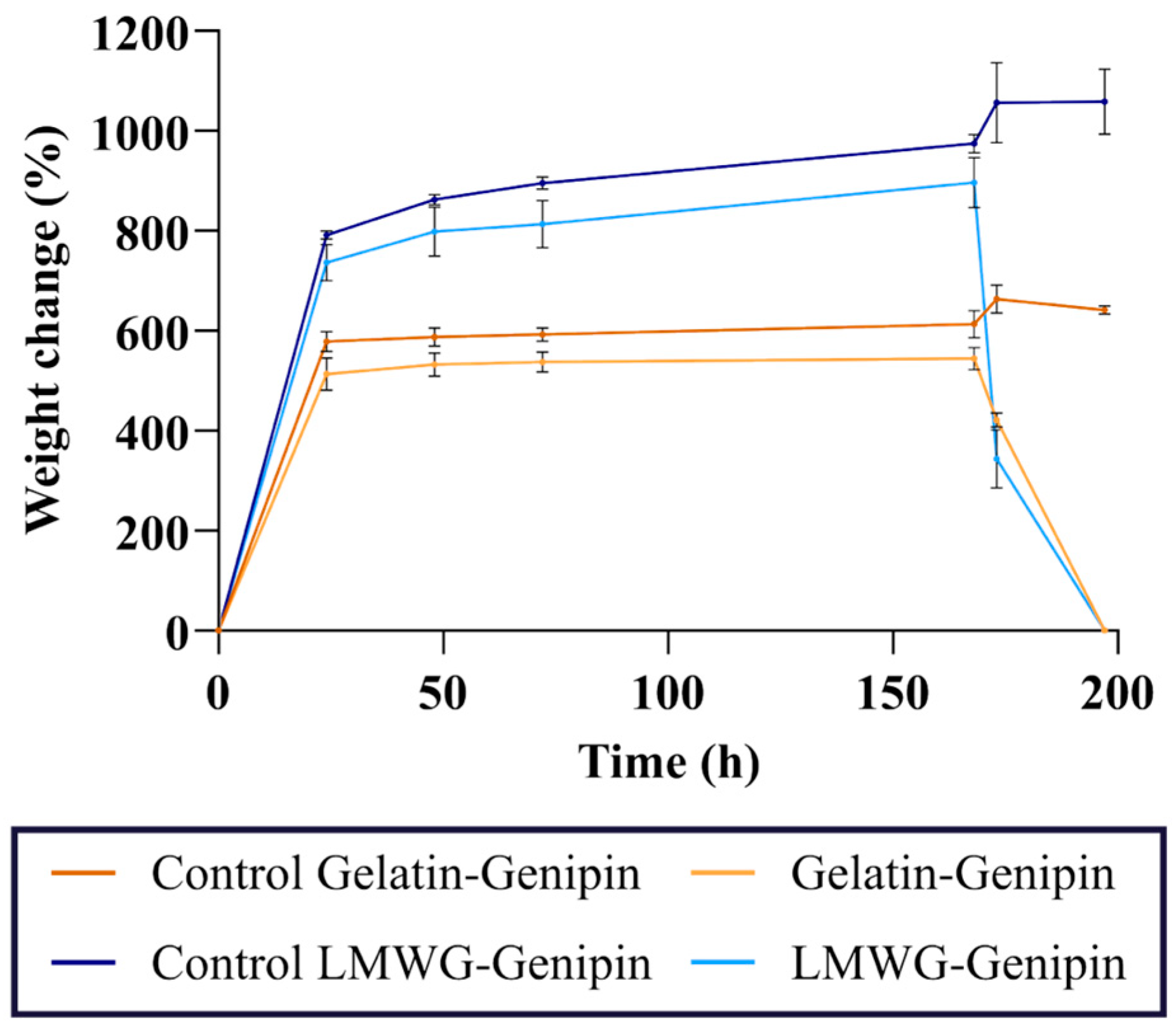| Properties | Gelatin-Genipin 6wt%–1wt% | LMWG-Genipin 6wt%–1wt% |