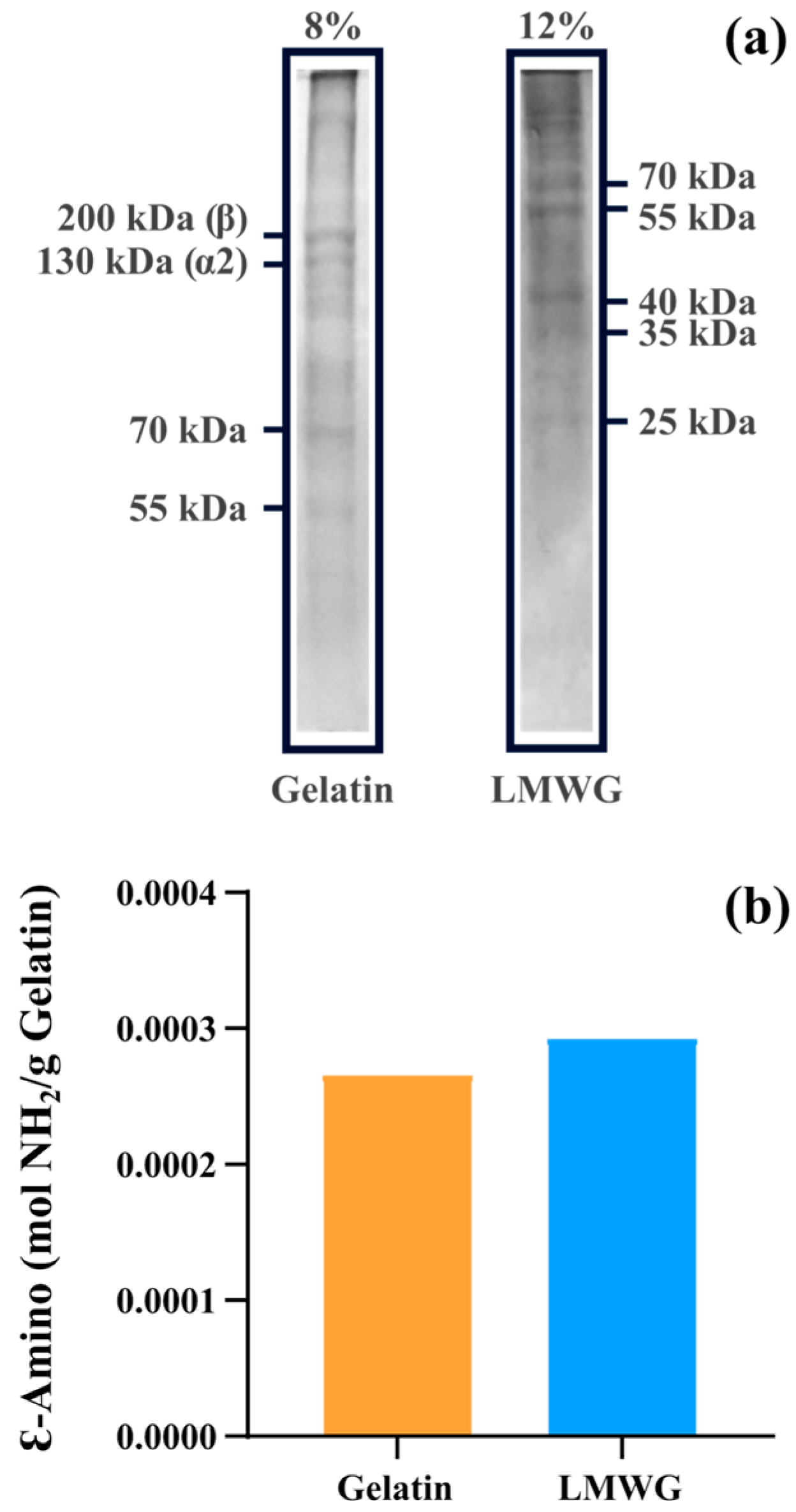 - Gu, S.; Wang, Z.; Dong, J.; Bao, Z.; Zeng, M.; He, Z.; Chen, Q.; Chen, J. Effect of Molecular Weight and Distribution of Bovine Bone Gelatin on the Cross-Linking Gelation Induced by Transglutaminase. Int. J. Biol. Macromol. 2025, 294, 139306. [Google Scholar] [CrossRef]