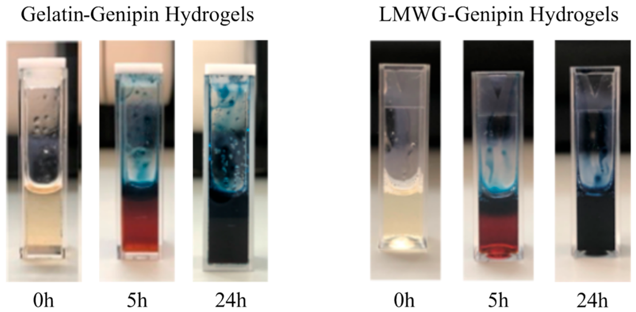 - Kirchmajer, D.M.; Watson, C.A.; Ranson, M.; Panhuis, M. In Het Gelapin, a Degradable Genipin Cross-Linked Gelatin Hydrogel. RSC Adv. 2013, 3, 1073–1081. [Google Scholar] [CrossRef]