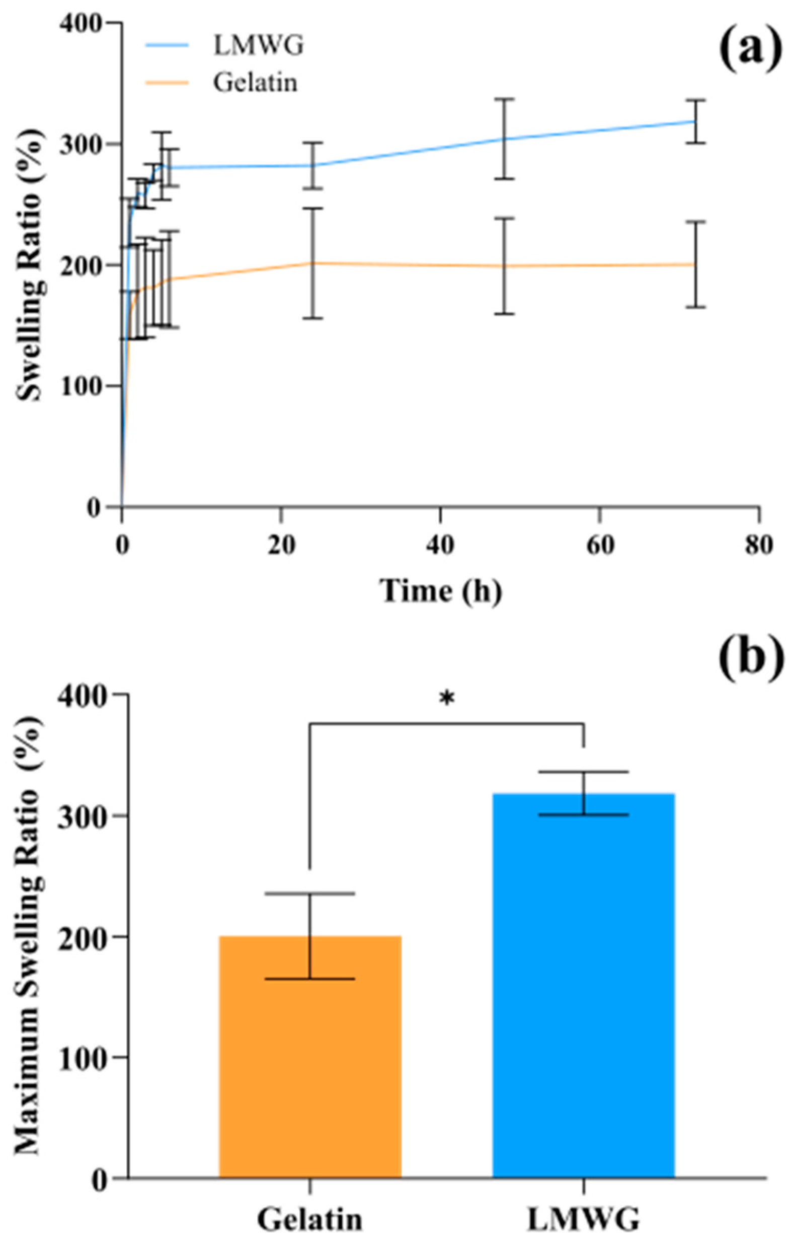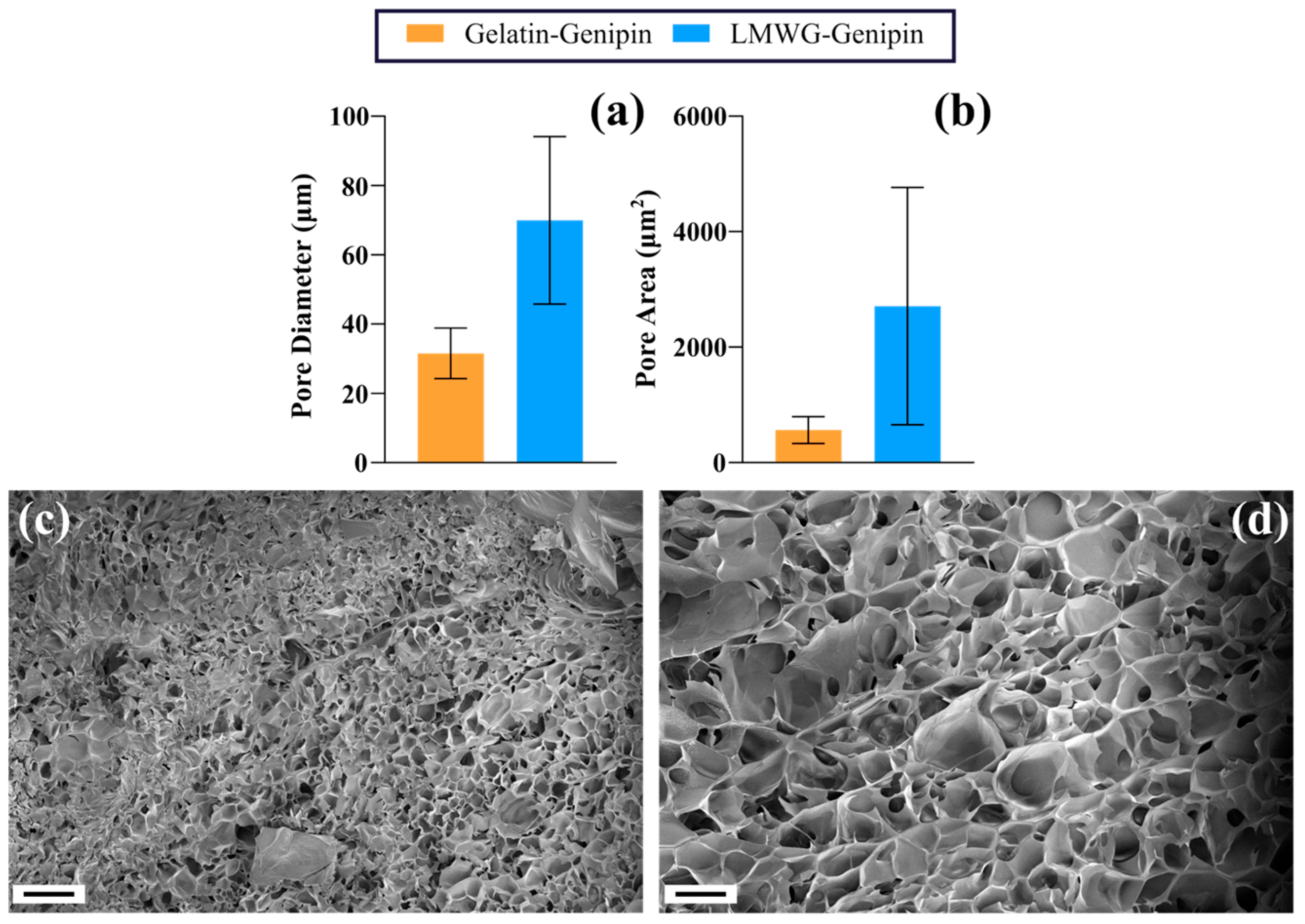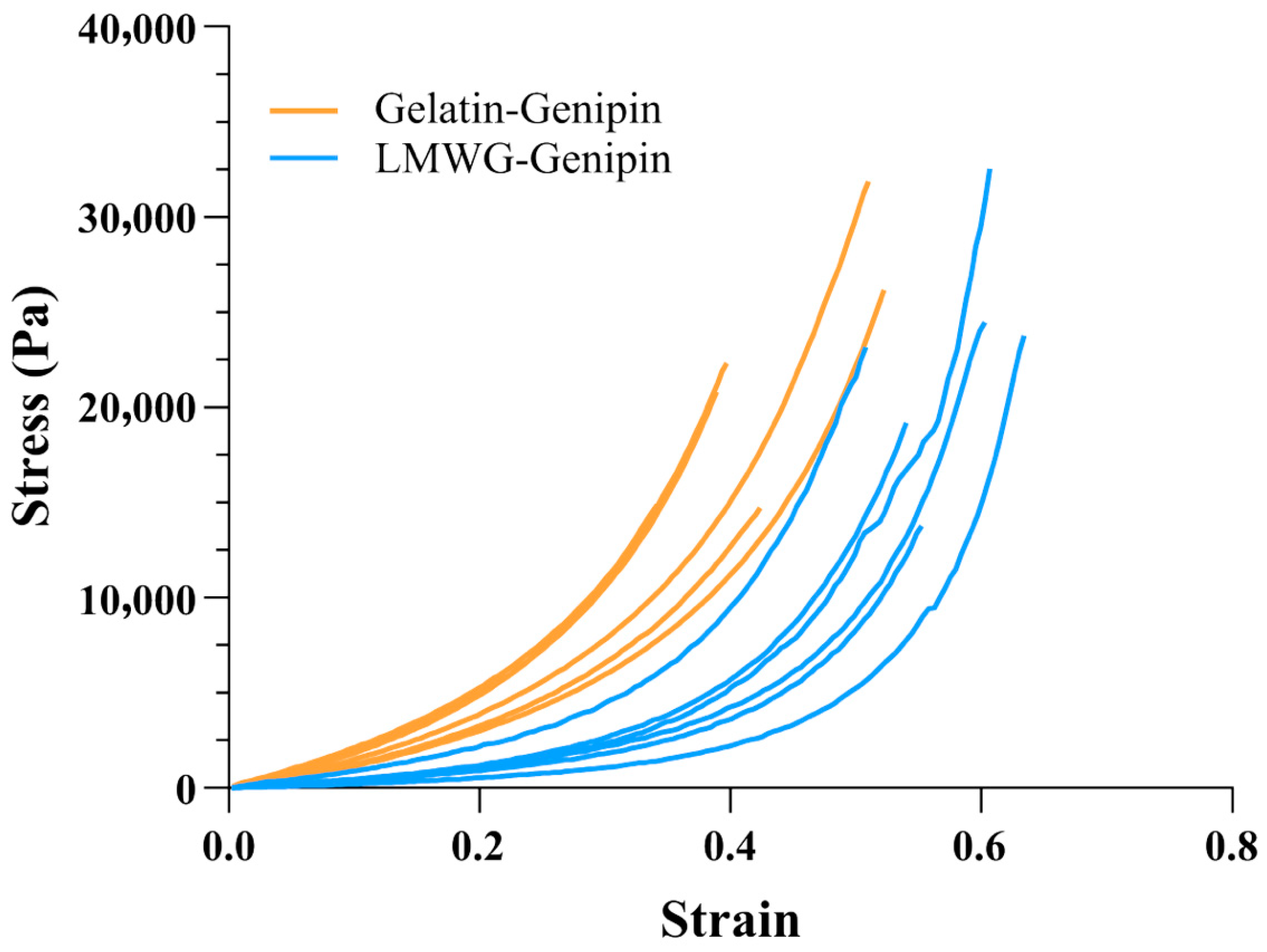 | Gelatin-genipin 37 °C | 3492.28 ± 959.86 | 6.52 ± 1.97 | Gelatin-genipin 25 °C/LMWG-genipin 25 °C | 0.0267 | 0.00217 |