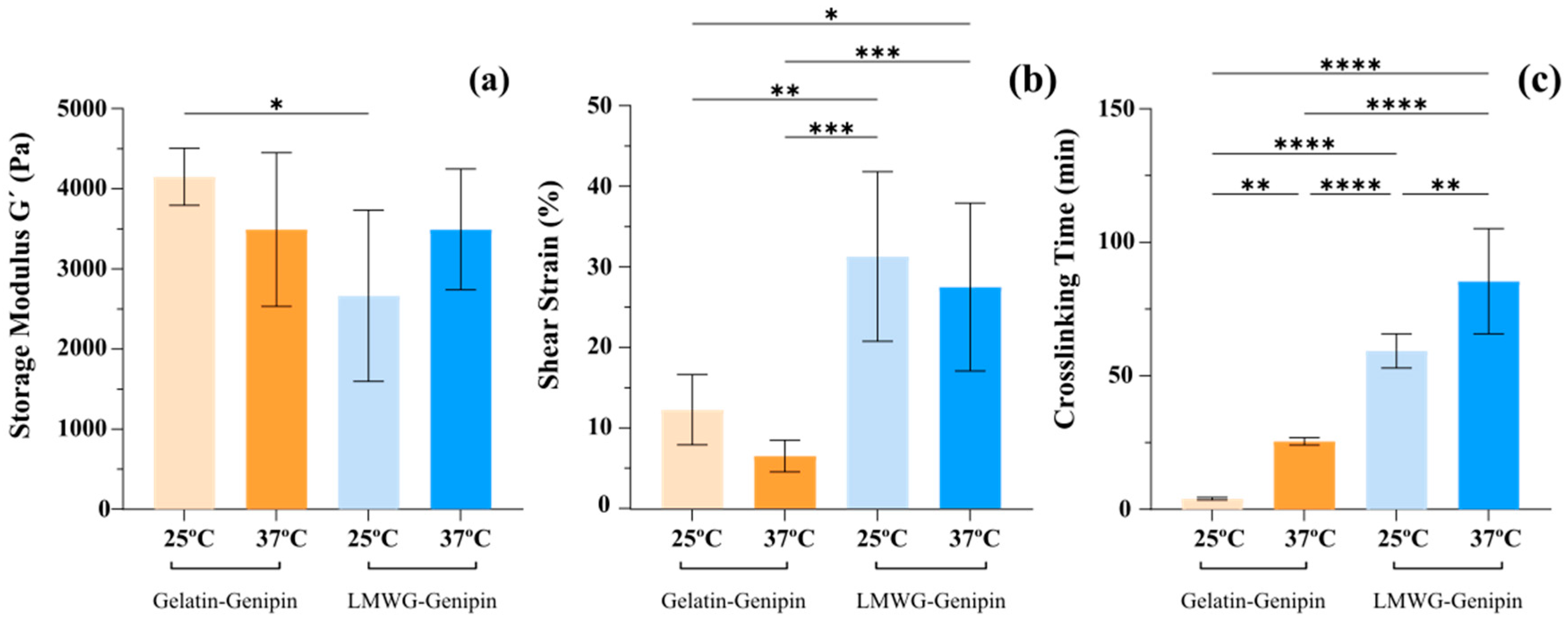 | LMWG-genipin 25 °C | 2663.38 ± 1069.71 | 31.30 ± 10.53 | LMWG-genipin 25 °C/LMWG-genipin 37 °C | 0.3362 | 0.8321 |