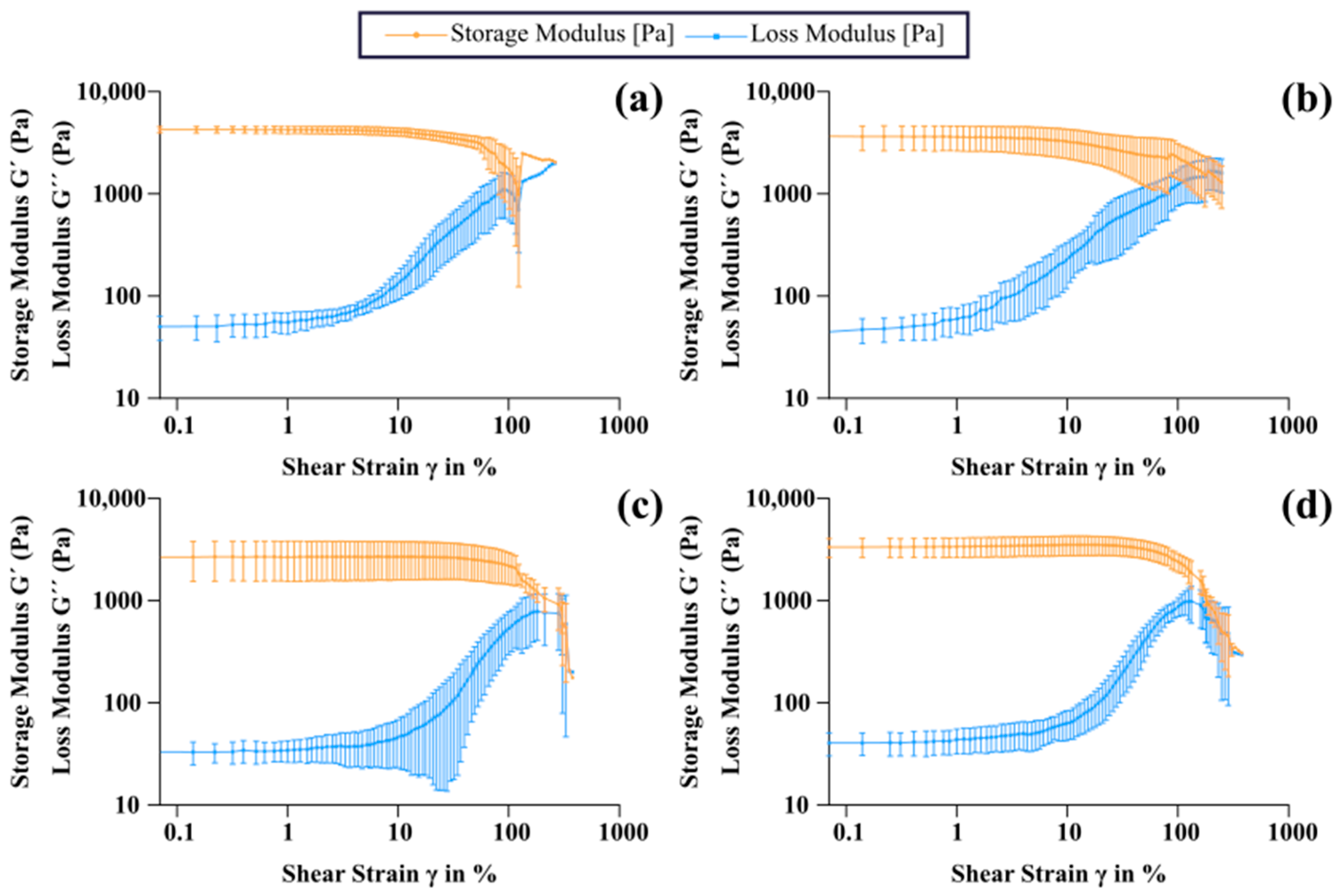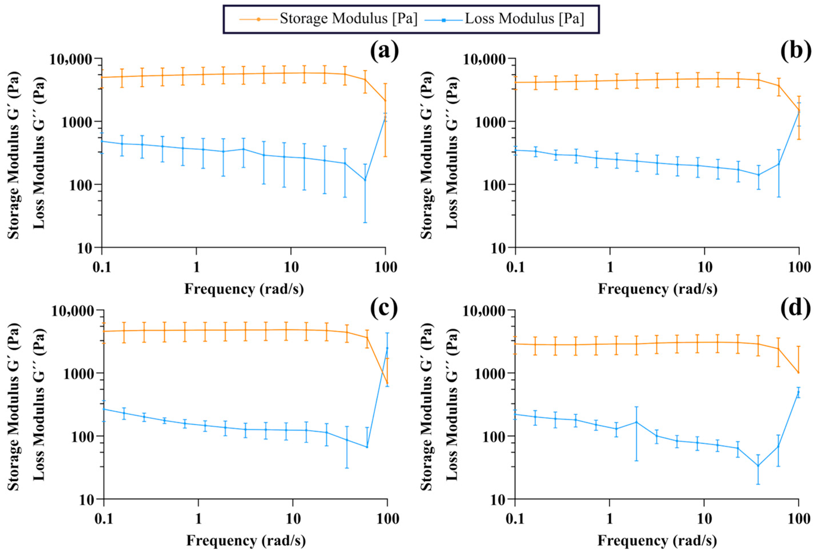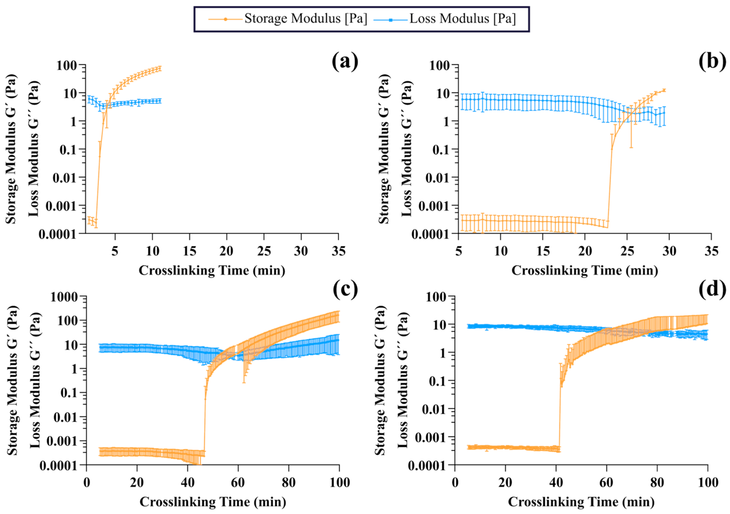 | Hydrogel | Parameter | Amplitude Sweep | Frequency Sweep | Gelation Time |