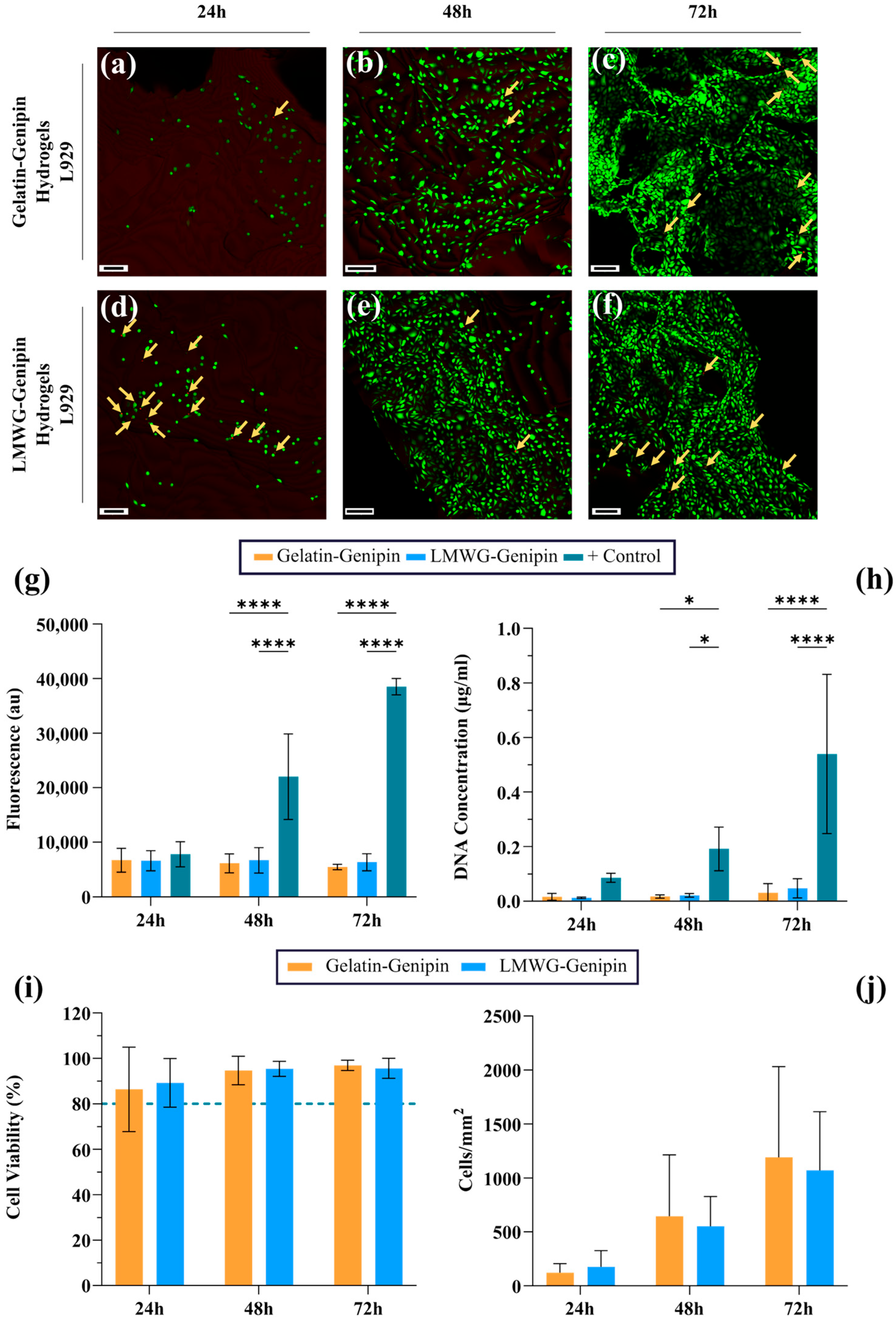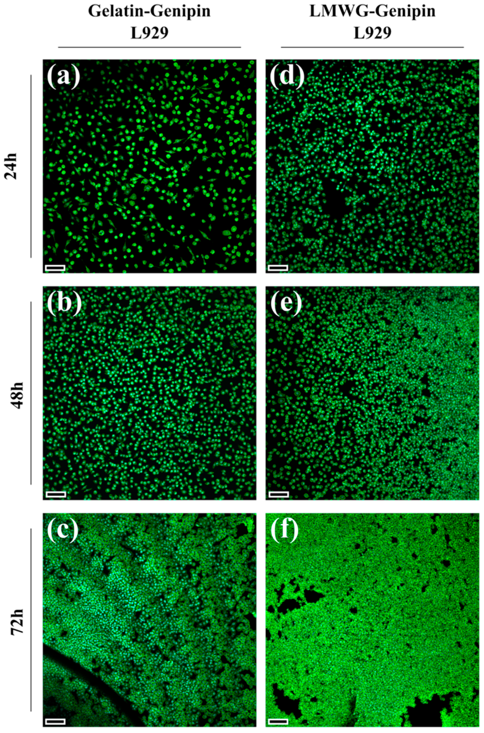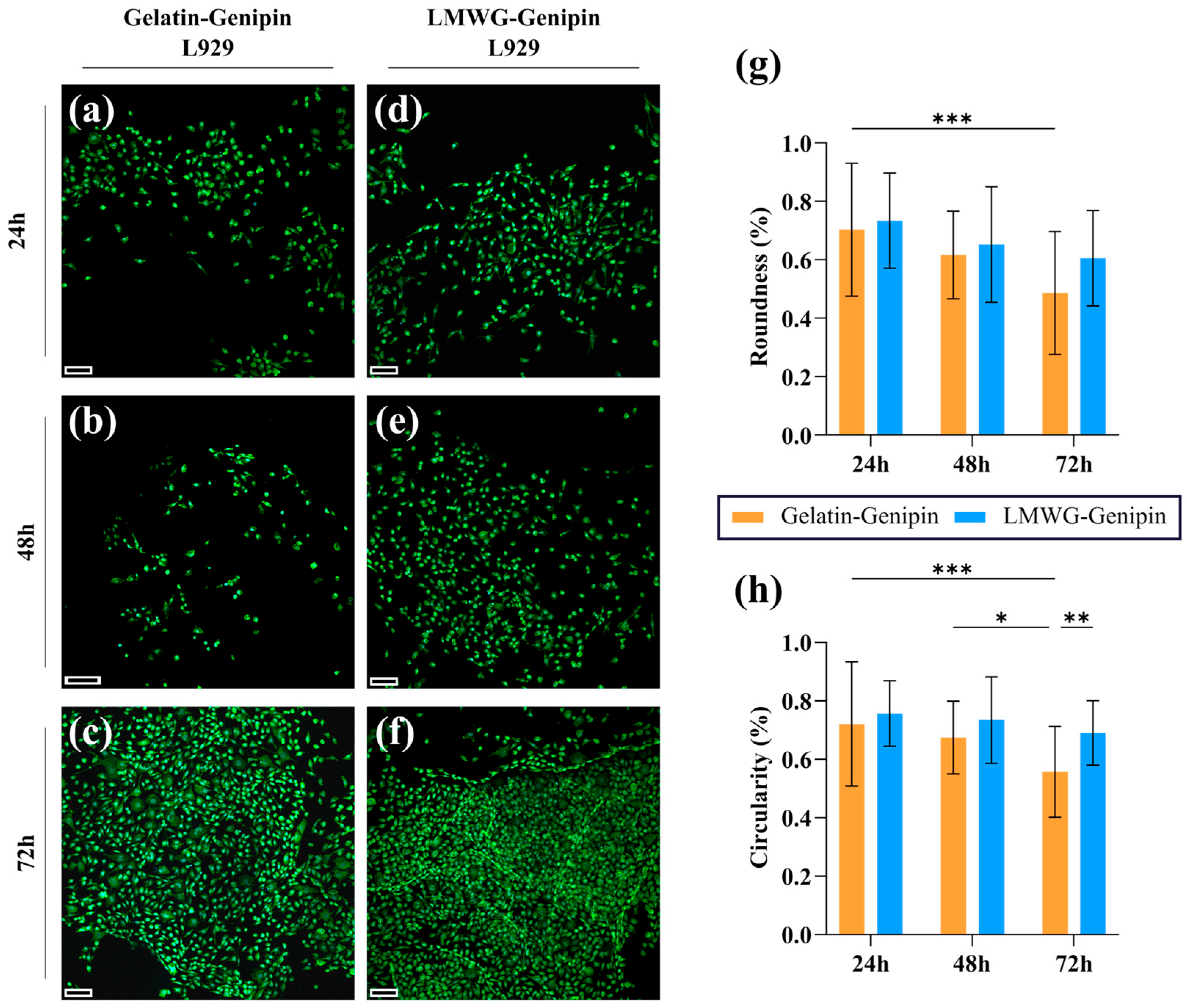 | LMWG-genipin 37 °C | 3492.32 ± 754.63 | 27.50 ± 10.42 | Gelatin-genipin 37 °C/LMWG-genipin 37 °C | 0.99995 | 0.0008 |