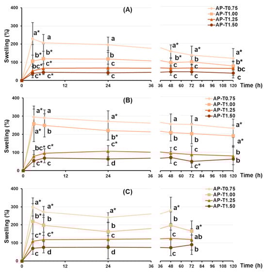 The swelling behavior of the pectin–TEOS hydrogels during 120 h incubation in Hanks’ solution at pH 5.0 (A), 7.4 (B), and 8.0 (C) at a temperature of 37 °C. Different lowercase letters indicate differences (p < 0.05) between pectin–TEOS hydrogels. *—p < 0.05 compared to the previous incubation time point for the respective gel sample. n = 8.