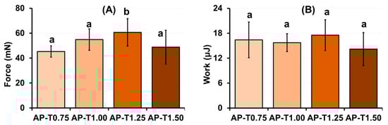 The strength of adhesion (A) and work of adhesion (B) of pectin–TEOS hydrogels. Different lowercase letters indicate differences (p < 0.05) between pectin–TEOS hydrogels. n = 8.