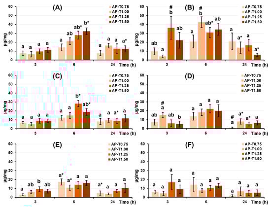 Effect of AP-T0.75, AP-T1.00, AP-T1.25, and AP-T1.50 hydrogels on C3a production in the whole blood in vitro. Different lowercase letters indicate differences (p < 0.05) between pectin–TEOS hydrogels. n = 8.