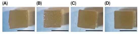 Representative images of hydrogel cubes of AP-T0.75 (A), AP-T1.00 (B), AP-T1.25 (C), and AP-T1.50 (D) hydrogels. Bar—10 mm.