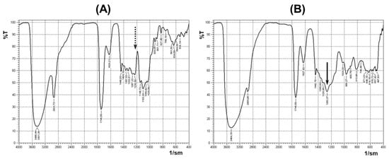 FTIR spectra of pectin AU202 (A) and pectin–TEOS gel AP-T0.75 (B). The dashed arrow shows the absence of the absorption band; the solid arrow shows the presence of the absorption band.