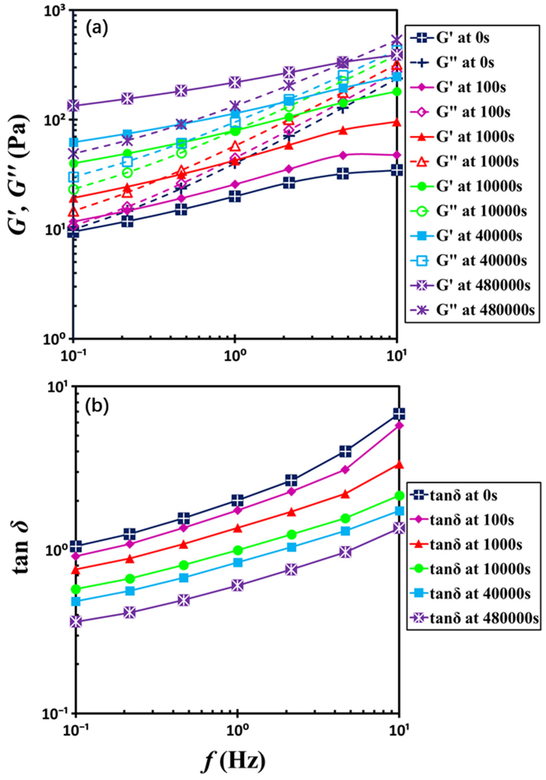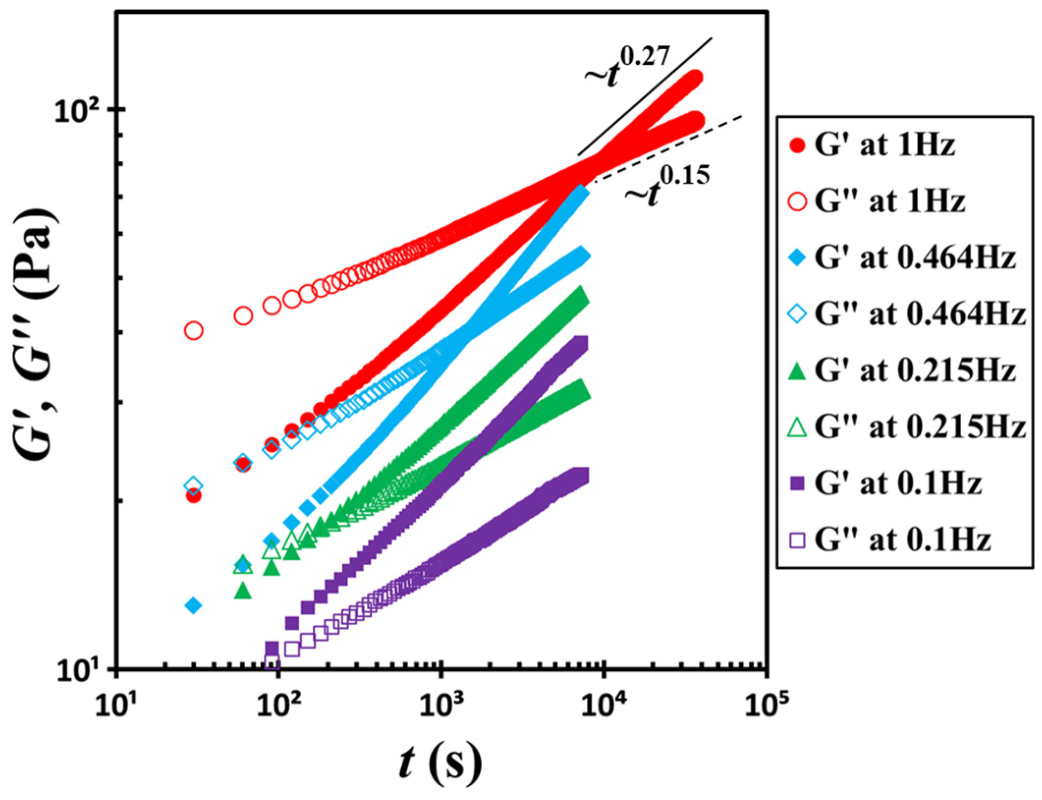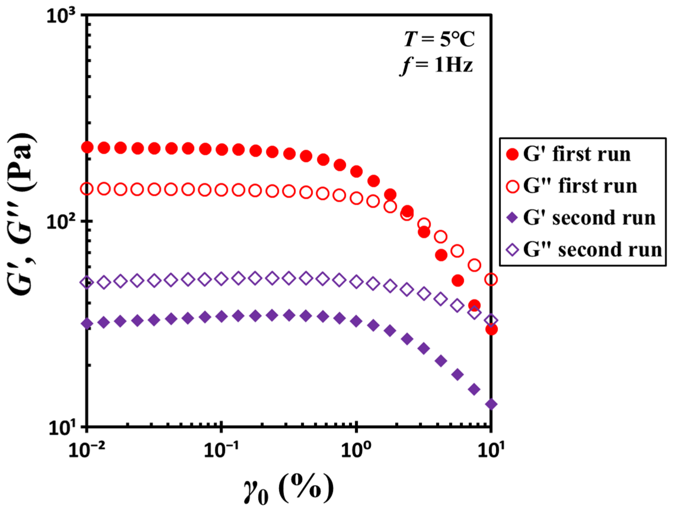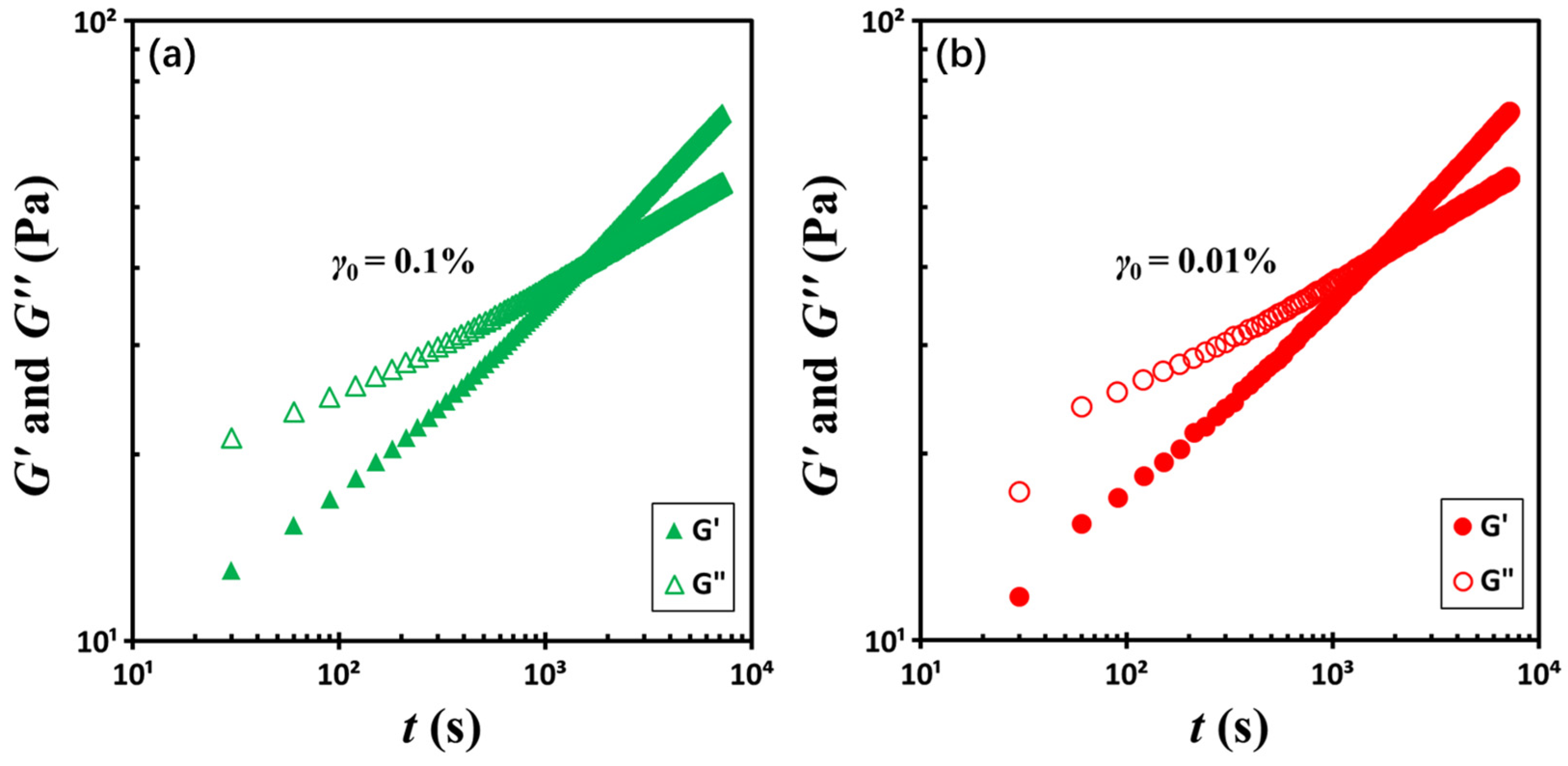 , two time-sweep experiments were then performed at a constant frequency of 0.464 Hz but with differing strain amplitudes: 0.1% and 0.01%. According to the relationship