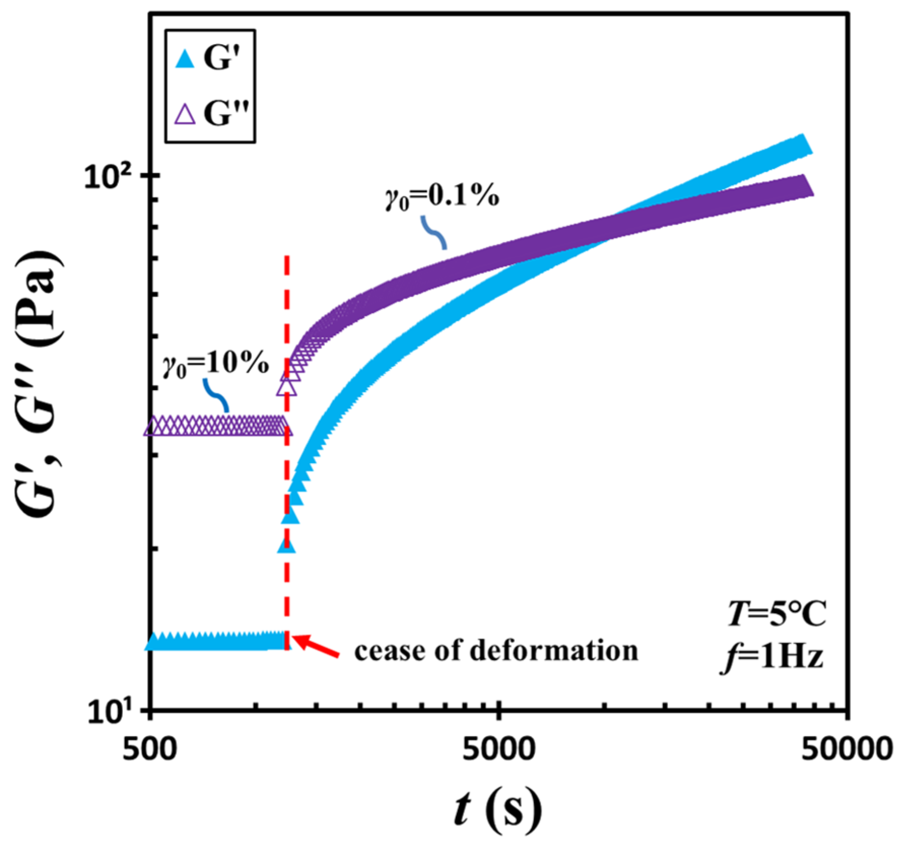 To examine structural recovery, the material was subjected to shear at 10% strain amplitude and a frequency of 1 Hz for an additional 20 min. Subsequently, the strain amplitude was abruptly reduced from 10% to 0.1%, and an oscillatory time-sweep test was conducted to monitor the temporal evolution of viscoelastic properties. Here, a strain amplitude of 0.1% was selected to ensure measurements remained within the linear viscoelastic regime while still generating sufficient torque signals. The result is shown in