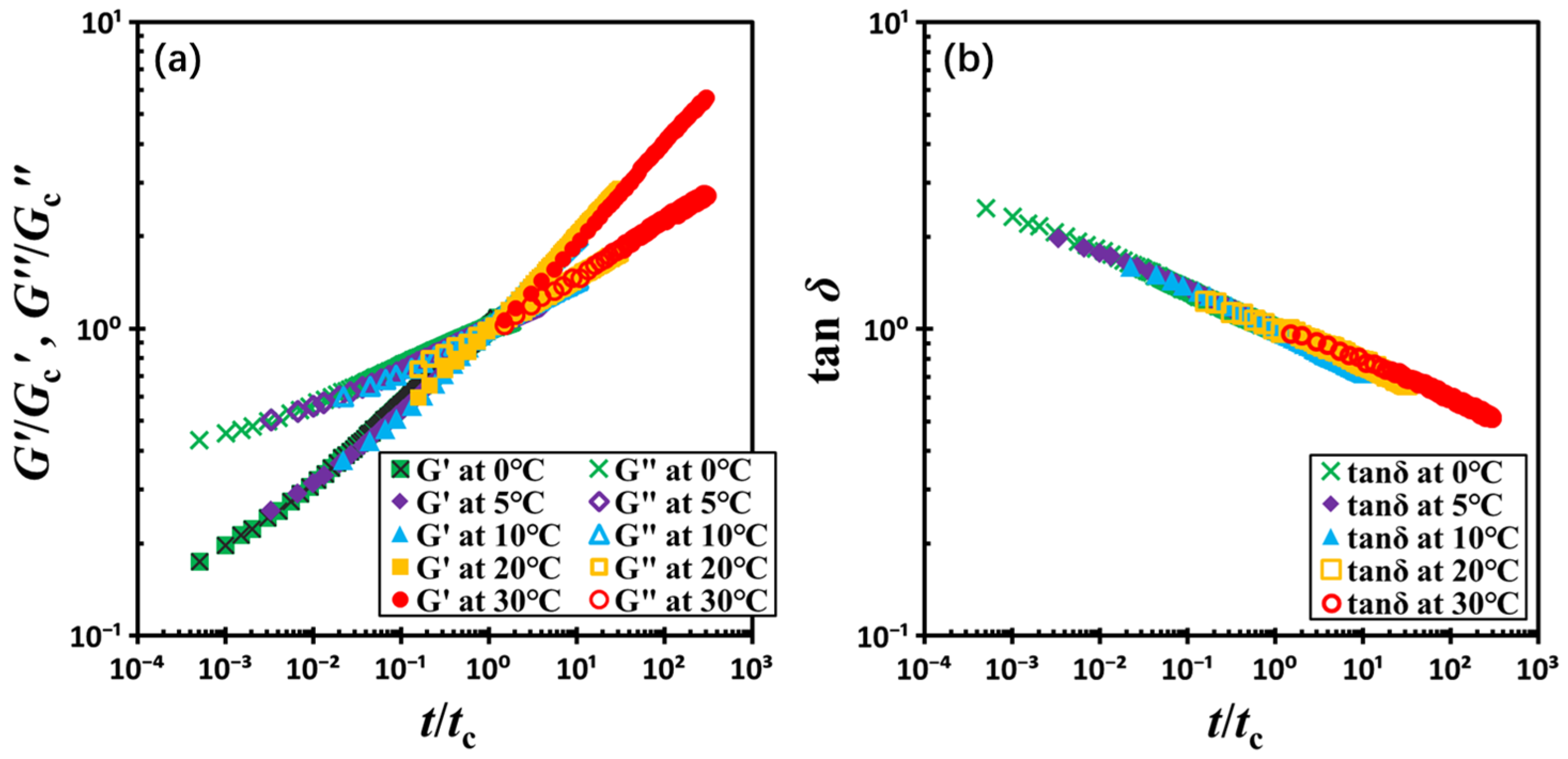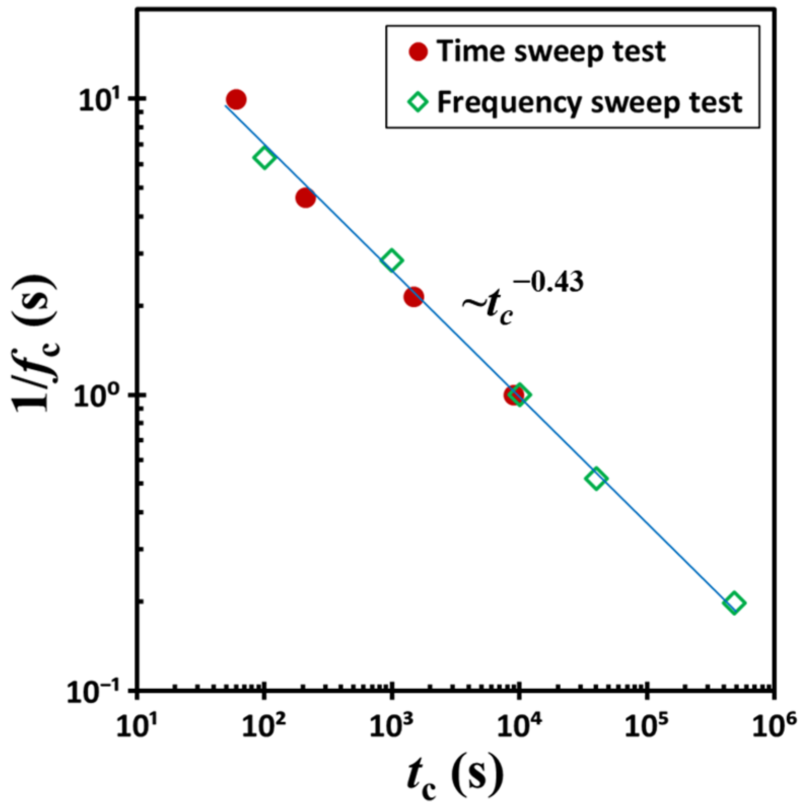 Given the increasing reliance on dynamic rheometers to determine sol–gel transition behavior, it is important to clarify the role of oscillatory frequency in this context. Although high-frequency oscillations could conceivably influence the material’s microstructure, mechanical destruction is generally considered to be negligible during gel point identification, provided the strain amplitudes remain sufficiently low and within the linear viscoelastic regime. This assumption appears to be well-supported from both theoretical and experimental perspectives. Theoretically, it draws from the principles of critical phenomena and the physics of percolation networks in soft matter, which predict that the gel point exhibits universal characteristics that are independent of frequency variation [