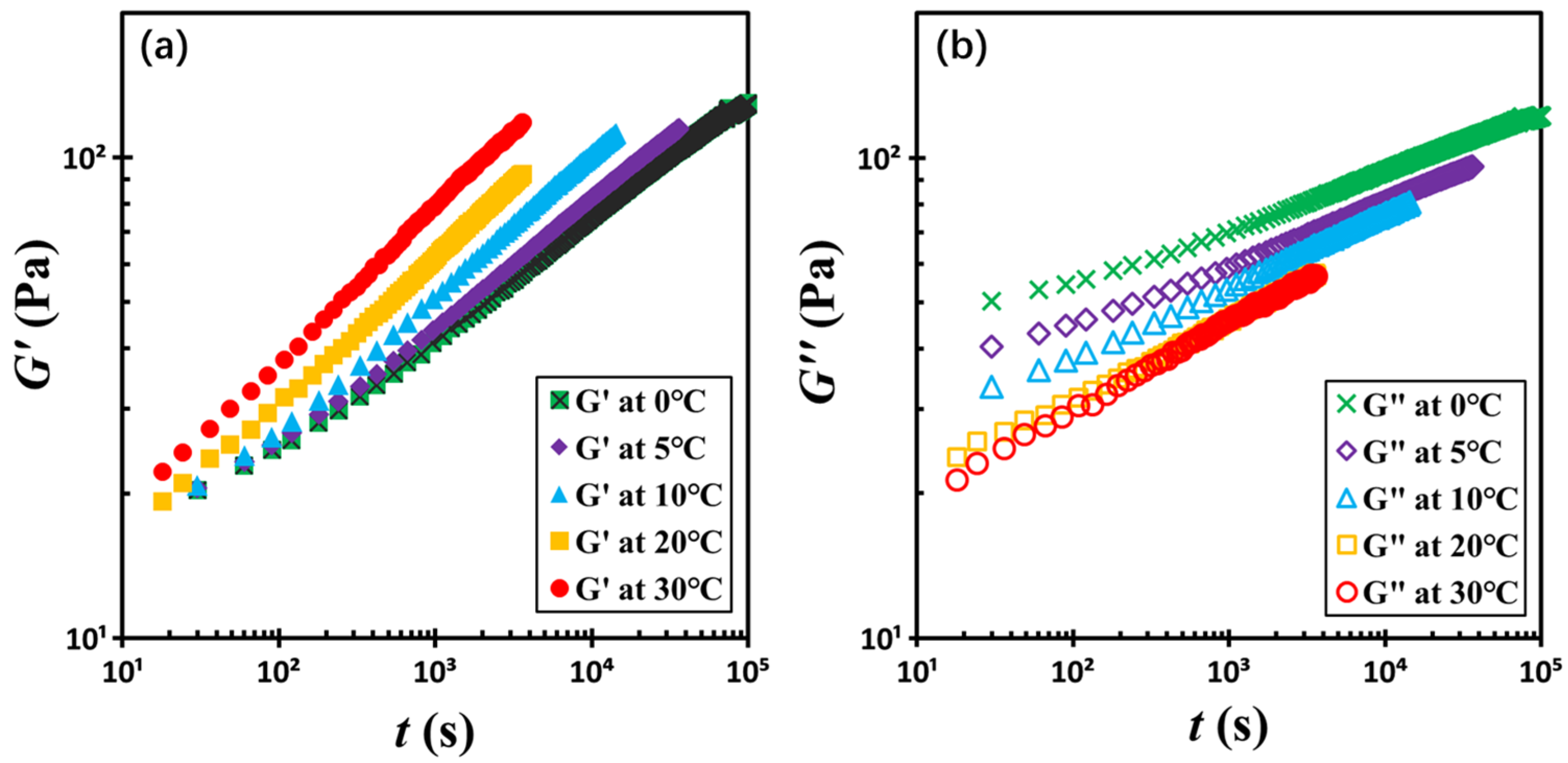 Figure 7. Remarkably, the moduli evolution curves obtained at different temperatures can be collapsed onto a single master curve through a two-step normalization process. First,