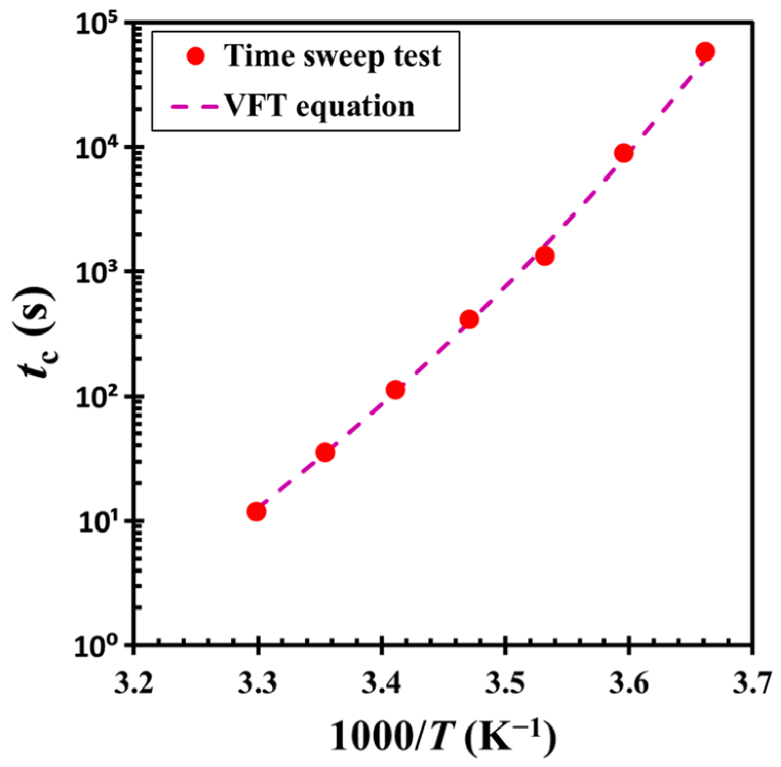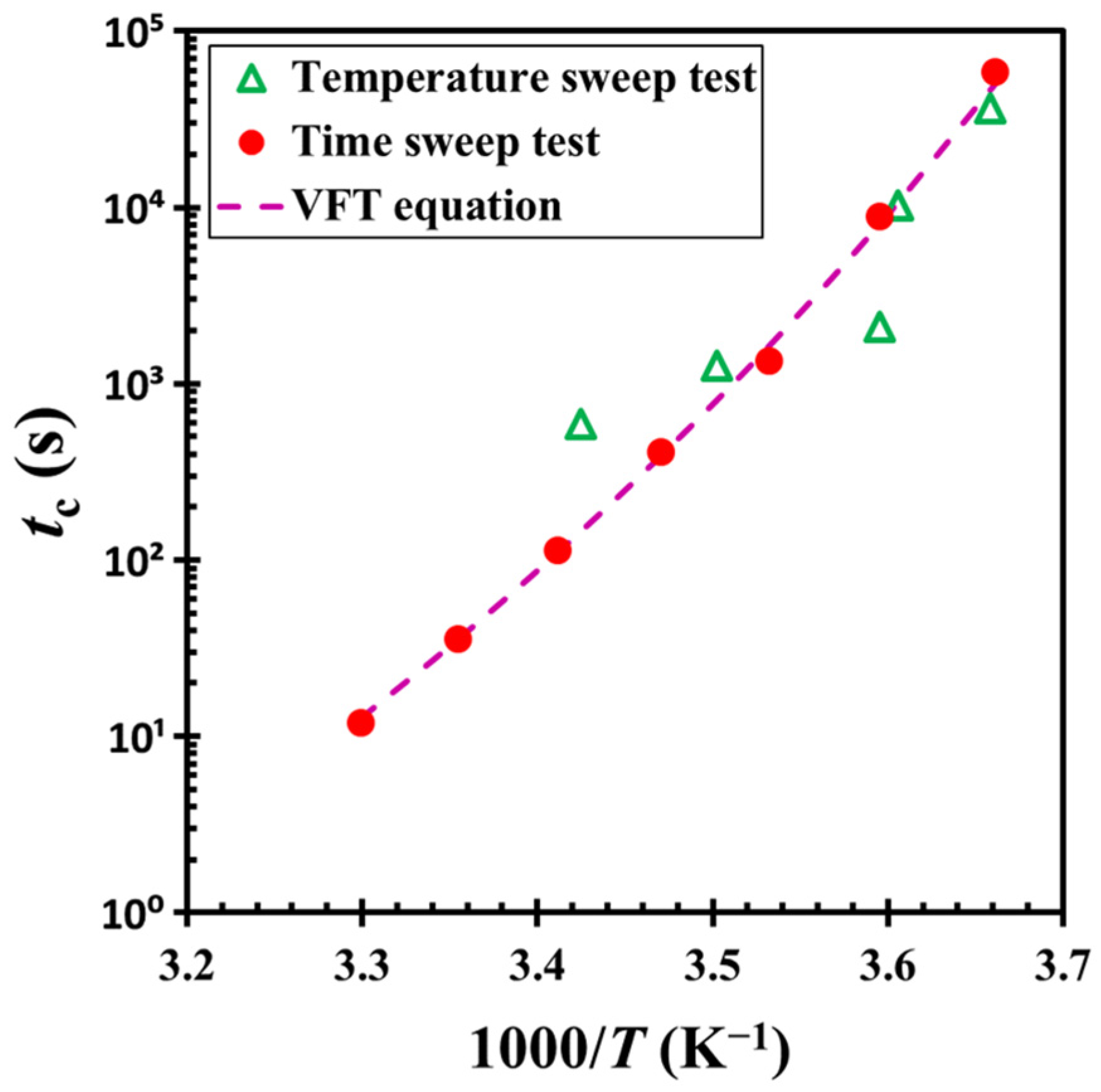 tc under non-isothermal conditions follows the same trend predicted by the VFT relationship. However, the data exhibit greater scatter in this case compared to those obtained under isothermal conditions. This variability is likely due to the discrepancies between the rheometer’s thermal chamber temperature and the actual sample temperature, which may not be uniform throughout the non-isothermal testing process.