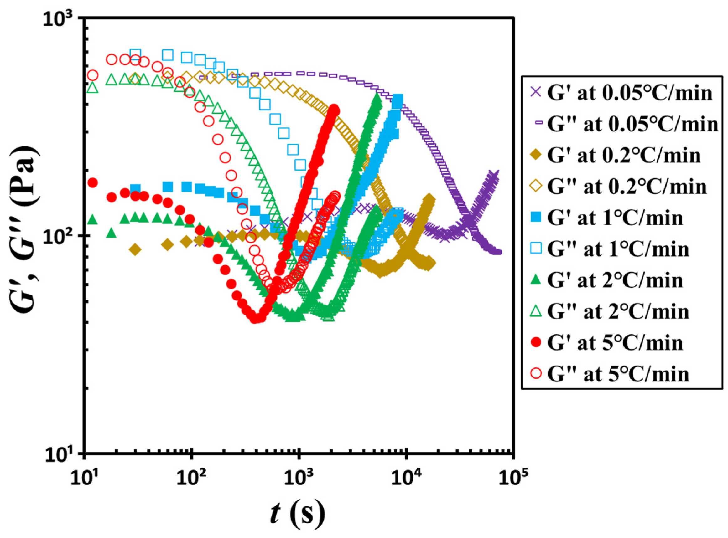 To further verify the influence of temperature on the sol–gel transition behavior, we conducted a series of non-isothermal temperature ramp-up experiments.