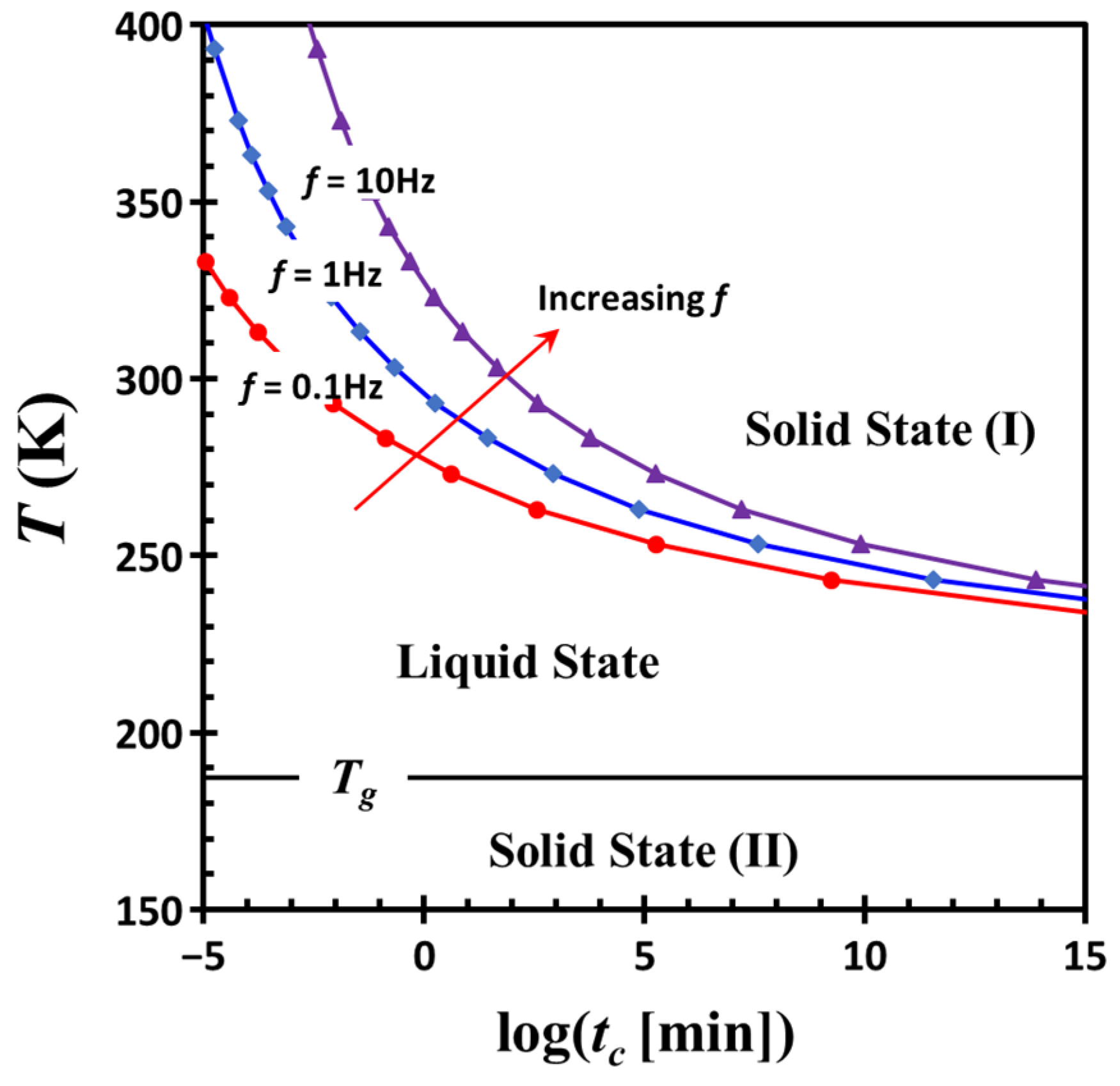 Figure 13), illustrating the transition between liquid-like and solid-like states as a function of time, temperature, and excitation frequency. This diagram highlights several key features, including the glass transition temperature