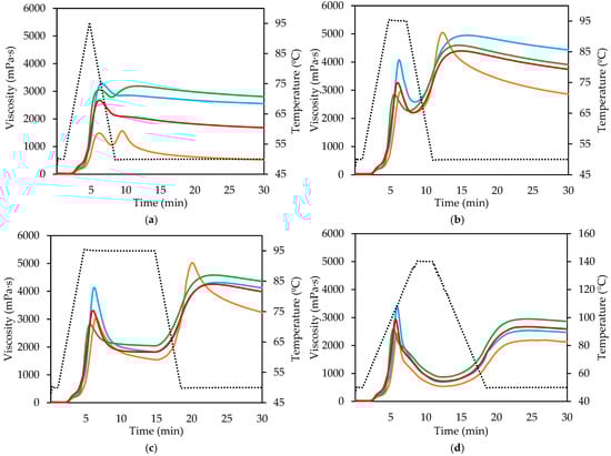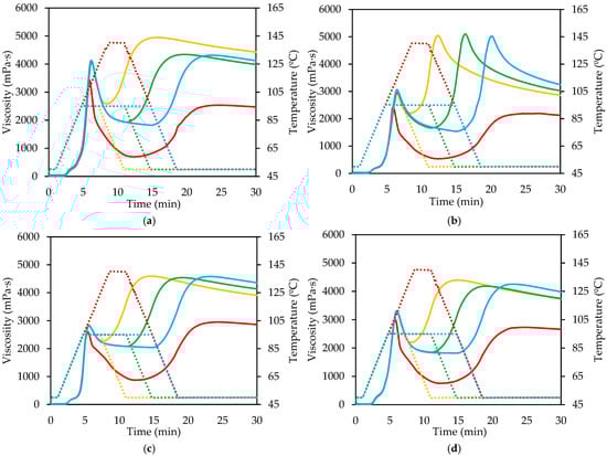 Viscosity profile of flours and semolina: (a) minimum treatment time (0.01 min at 95 °C); (b) standard treatment (2.50 min at 95 °C); (c) maximum treatment time (10.03 min at 95 °C); (d) high-temperature treatment (2.50 min at 140 °C). Temperature profile (dashed line); Common wheat flour (blue curve); Durum wheat flour (orange curve); Durum wheat semolina (green curve), and Re-milled durum wheat semolina (red curve).