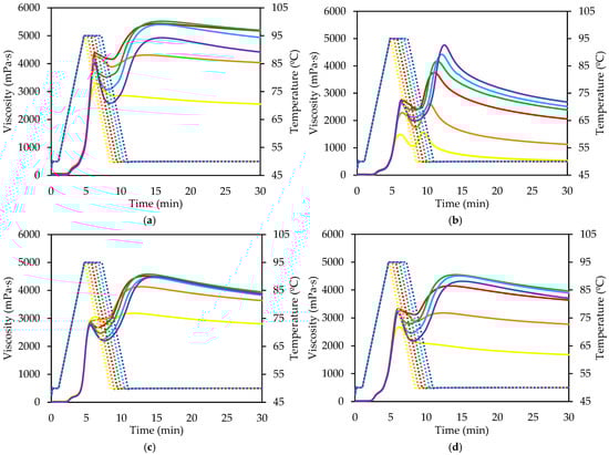 - Liu, S.; Yuan, T.Z.; Wang, X.; Reimer, M.; Isaak, C.; Ai, Y. Behaviors of starches evaluated at high heating temperatures using a new model of Rapid Visco Analyzer—RVA 4800. Food Hydrocoll. 2019, 94, 217–228. [Google Scholar] [CrossRef]