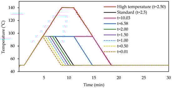 The temperature ramp established during the experimental phase (Figure 4) consisted of an initial holding step at 50 °C for one minute, followed by heating at a rate of 6 °C per minute until the target temperature was reached. This target temperature was either 95 °C for the standard method or 140 °C for the high-temperature method. Once the target temperature was reached, the samples were held at that temperature for a predetermined duration. For the standard method (95 °C), various holding times were applied: 0.01, 0.5, 1.0, 1.5, 2.0, 2.5, 6.96 and 10.0 min. These corresponded to curves t = 0.01, t = 0.5, t = 1.0, t = 1.5, t = 2.0, t = 2.5, t = 6.96 and t = 10.0, respectively. The high-temperature profile involved holding the samples at 140 °C for 2.5 min. After this, the samples were cooled at a rate of 6 °C per minute until they reached 50 °C and were then maintained at this temperature until the total analysis time reached 30 min. All measurements were carried out in triplicate.