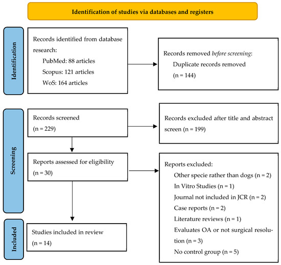 The literature search initially identified 373 records from electronic databases (PubMed, Scopus, and Web of Science). After removing 144 duplicates, a total of 229 titles and abstracts were screened for eligibility. Of these, 199 studies were excluded because they were unrelated to orthopedic surgery, performed in species other than dogs, were reviews, or did not involve PRP application.