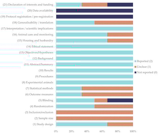 Regarding individual domains, the study design was adequately reported in 66.7% of the studies [18,60,61,62], while randomization [60,61,62] and blinding [18,60,61] were fully described in 50.0% of the studies; blinding was not reported in 33.3% of the studies [63,64]. Sample size was determined to be unclear in all studies. Outcome measures [60,61] and statistical methods [60,62] reached full reporting in 33.3% of the studies, with the remainder being unclear (66.7%) [18,62,63,64]. In contrast, core descriptive items showed uniformly high adherence: experimental animals, procedures, results, abstracts, backgrounds, objectives, and ethical statements were fully reported in 100% of the studies. Housing and husbandry was totally reported in 66.7% of the studies [18,60,61,62], while this was unclear in 33% of studies [63,64]. Animal care and monitoring was fully reported in 66.7% [18,60,61,62] and not reported in 33.3% [63] of the studies; interpretation/scientific implications were fully reported in 100% of the studies. Generalizability/translation reached 50.0% full reporting [60,61,62]. In contrast, protocol registration and data availability were absent in all studies. Declaration of interests/funding was heterogeneous (reported 33.3% [18,62], unclear 33.3% [60,61], and not reported 33.3% [63,64]).