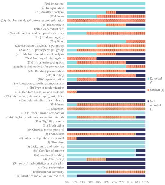 The following items were classified as “unclear”, meaning that the information was incomplete or some sub-elements were missing: (9) trial design (87.5%), (12b) eligibility criteria—sites and individuals (75%), (14) outcomes (100%), (15) harms (87.5%), (17a) random allocation and methods (12.5%), (19) implementation (25%), (20a) blinding (50%) (20b) blinding performance (75%), (21b) inclusion in each group (62.5%), (21c) handling of missing data (37.5%), (21d) methods for additional analysis (25%), (22a) number of participants per group (87.5%), (22b) losses and exclusions per group (62.5%), (24a) intervention and comparator delivery (75%), (25) baseline data (25%), and (26) numbers analyzed for outcomes and estimation.