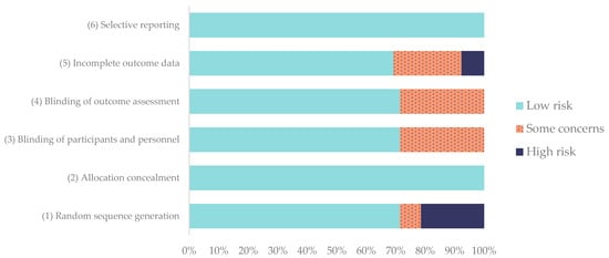 Eight of the studies [16,18,57,58,60,62,63,64] were judged as presenting an overall low risk of bias, while the remaining six [53,54,55,56,59,61] presented some concerns, mainly due to insufficient information about randomization or incomplete outcome reporting.