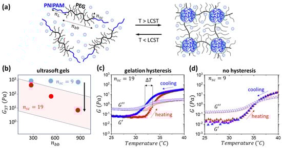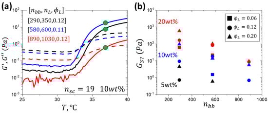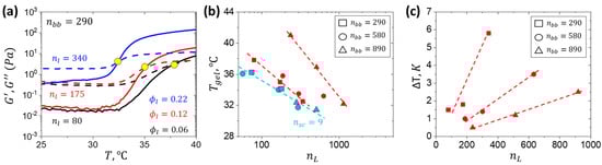 Gelation temperature (Tgel) is identified as a crossover of the G′ and G″ curves (Table A1) [32,33,34]. Consistent with the previously reported nsc = 9 hydrogels [31], Tgel increases with decreasing polymer concentration and PNIPAM volume fraction ϕL (Figure 5a). However, hydrogels with nsc = 19 demonstrate a strong dependence of Tgel on nbb (Figure 5b), indicated by a distinct slope for each data set at different nbb values in contrast to a collapse into the same trendline for the system with shorter side chains. In addition, Tgel spanned a range of approximately 10 °C at constant nL. Consistent with the SAXS data (Figure 3c), hydrogels with longer side chains exhibited notable thermal hysteresis, as evidenced by heating–cooling transition differences ranging from 0.5 to 6 °C (Figure 5c). The hysteresis is attributed to larger domains of entangled linear PNIPAM chains, which hinders network disassembly.