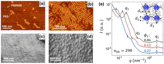 A series of structural studies were conducted to verify the triblock structure and microphase separation of the synthesized copolymers. Representative data are shown in Figure 2. Individual macromolecules were imaged by atomic force microscopy (AFM), where sparse and dense monolayers were deposited on graphite and mica and substrates, respectively. Special ultrasharp tips were used to obtain a clear resolution of both brush and linear blocks. For the imaging of the PNIPAM blocks, a controlled shear flow was applied during spin-coating of sparse monolayers to extend the linear chains (Figure 2a). The suggested designation of the constituting blocks (arrows) is based on the height analysis distributions, as shown in Figure A3, where thicker chains with a height of 1.5 ± 0.4 nm were attributed to PEG brush blocks, and thinner chains with a height of 0.34 ± 0.13 nm were attributed to PNIPAM linear blocks. In both dispersed (Figure 2a) and densely packed (Figure 2b) states, the brush blocks appeared as wormlike species, corroborating previous observations of bottlebrush macromolecules [31]. In thick films, scanning electron microscopy (SEM) images demonstrate well-defined spherical domains (Figure 2c,d), suggesting microphase separation of the PNIPAM and PEG blocks, corroborated by SAXS (Figure 2e). The domain size (d2) and interdomain distance (d3) increase with the degree of polymerization of the PNIPAM block (Table 1), which is consistent with the previous studies of LBL triblock copolymers [27,31]. The smaller molecules with nbb = 290 follow the theoretical prediction for the aggregation number (Q) increasing with nL. However, larger molecules demonstrate an inconsistent behavior, i.e., Q decreasing with nL, ascribed to kinetic hindrance, which is also manifested in modulus decreasing with nbb as discussed below. The very large Q = 2166 and 3134 are due to transitioning to cylindrical morphology at high PNIPAM volume fractions [27].