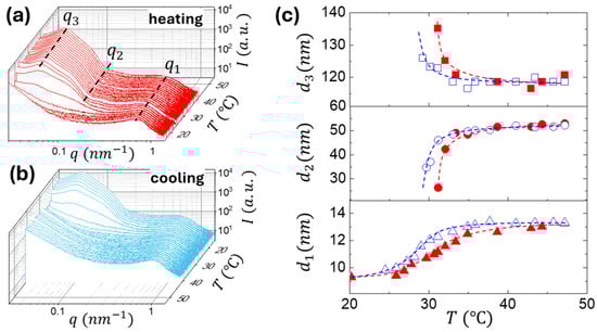 Temperature-dependent USAXS-SAXS profiles of PNIPAM–bbPEG–PNIPAM bottlebrush copolymer (nbb = 580 and ϕL = 0.20 at 15 wt%) recorded during (a) heating (15–50 °C) and (b) cooling (50–15 °C). (c) Evolution of structural parameters during the heating-cooling cycle: inter-brush spacing (d1 = 2π/q1), PNIPAM domain size (d2), determined by fitting the experimental scattering curves using a spherical form factor P(q), convoluted with a Gaussian size distribution at q2, and inter-domain distance (d3 = 2π/q3).