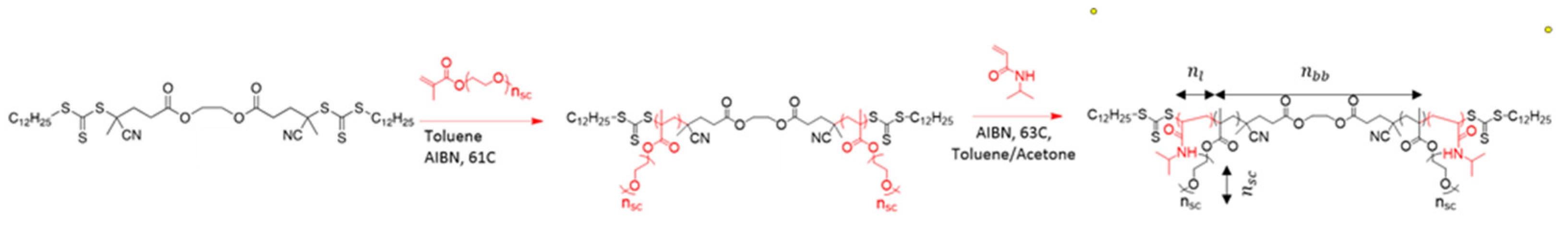 - Lapkriengkri, I.; Albanese, K.R.; Rhode, A.; Cunniff, A.; Pitenis, A.A.; Chabinyc, M.L.; Bates, C.M. Chemical Botany: Bottlebrush Polymers in Materials Science. Annu. Rev. Mater. Res. 2024, 54, 27–46. [Google Scholar] [CrossRef]