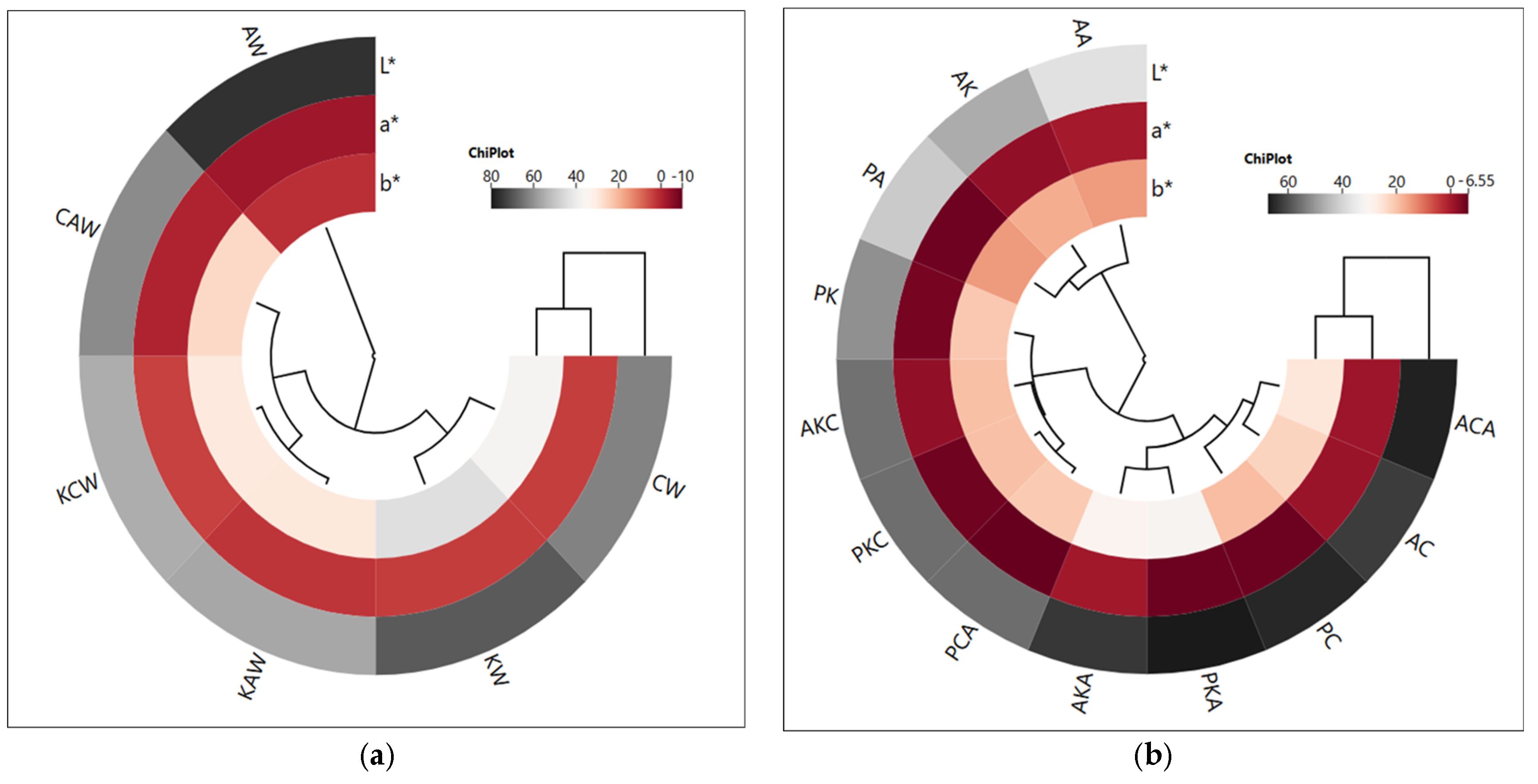 | CAW | 61.17 ± 1.11 b | −0.39 ± 0.13 b | 26.20 ± 0.14 b | 73.49 ± 0.09 d | 210 ± 0.00 a | |