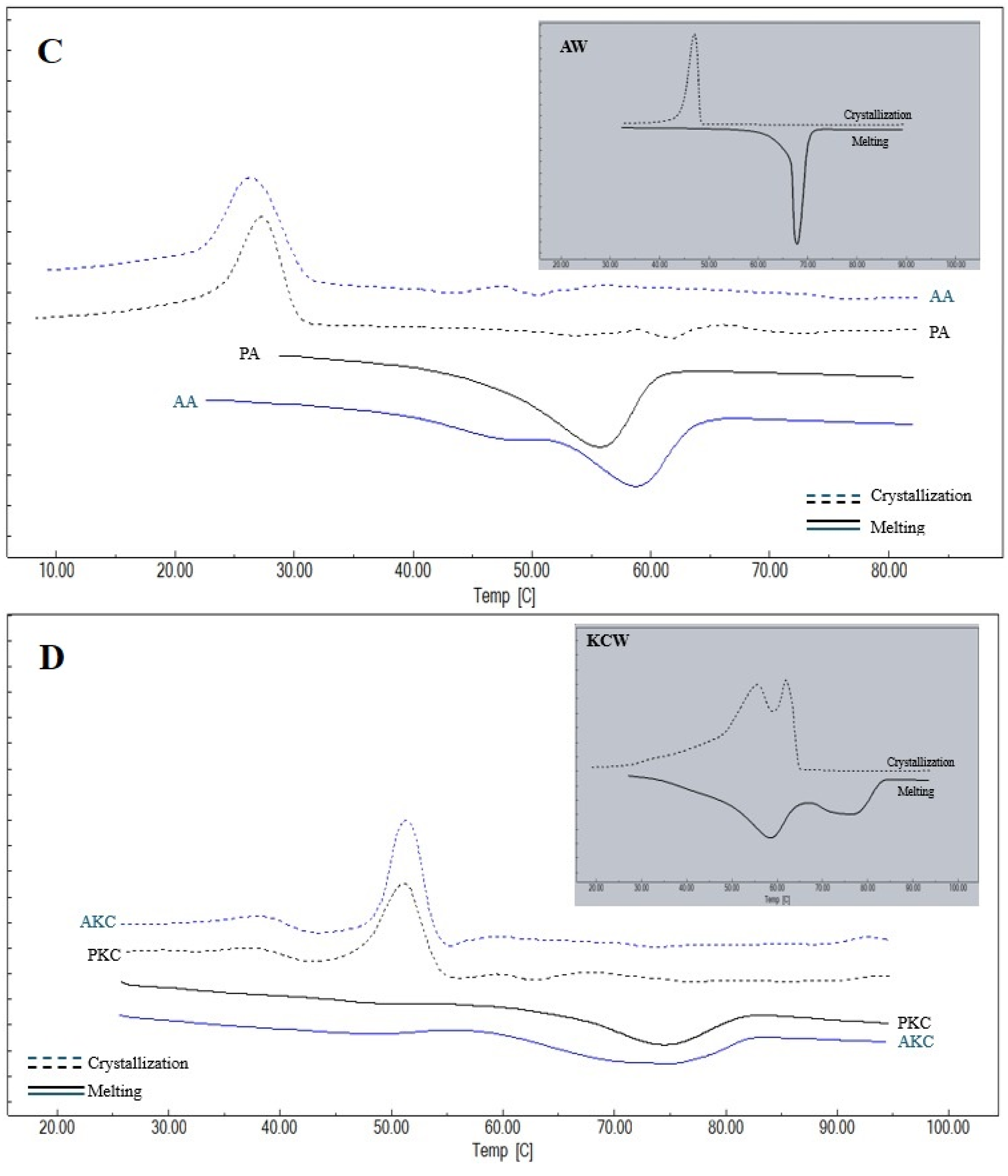 - Winkler-Moser, J.K.; Anderson, J.; Felker, F.C.; Hwang, H.-S. Physical Properties of Beeswax, Sunflower Wax, and Candelilla Wax Mixtures and Oleogels. J. Am. Oil Chem. Soc. 2019, 96, 1125–1142. [Google Scholar] [CrossRef]