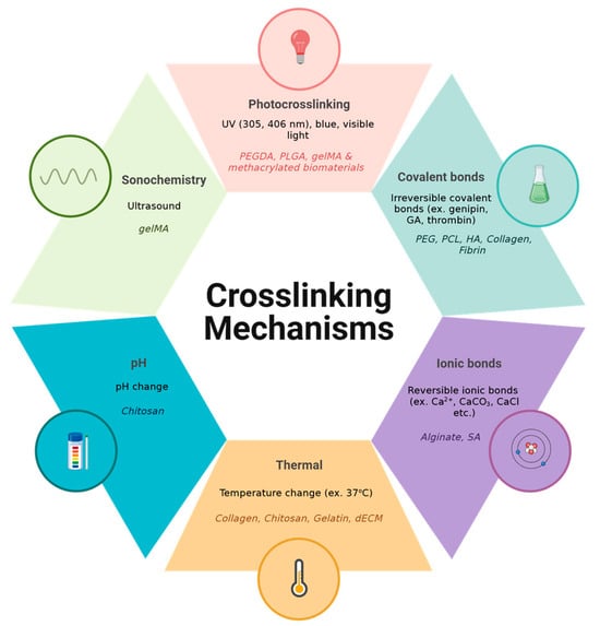 Summary of various crosslinking mechanisms and the biomaterials associated with each category. Created in BioRender. Jeschke, M. (2025) https://BioRender.com/t36a954 (accessed on 10 January 2025).